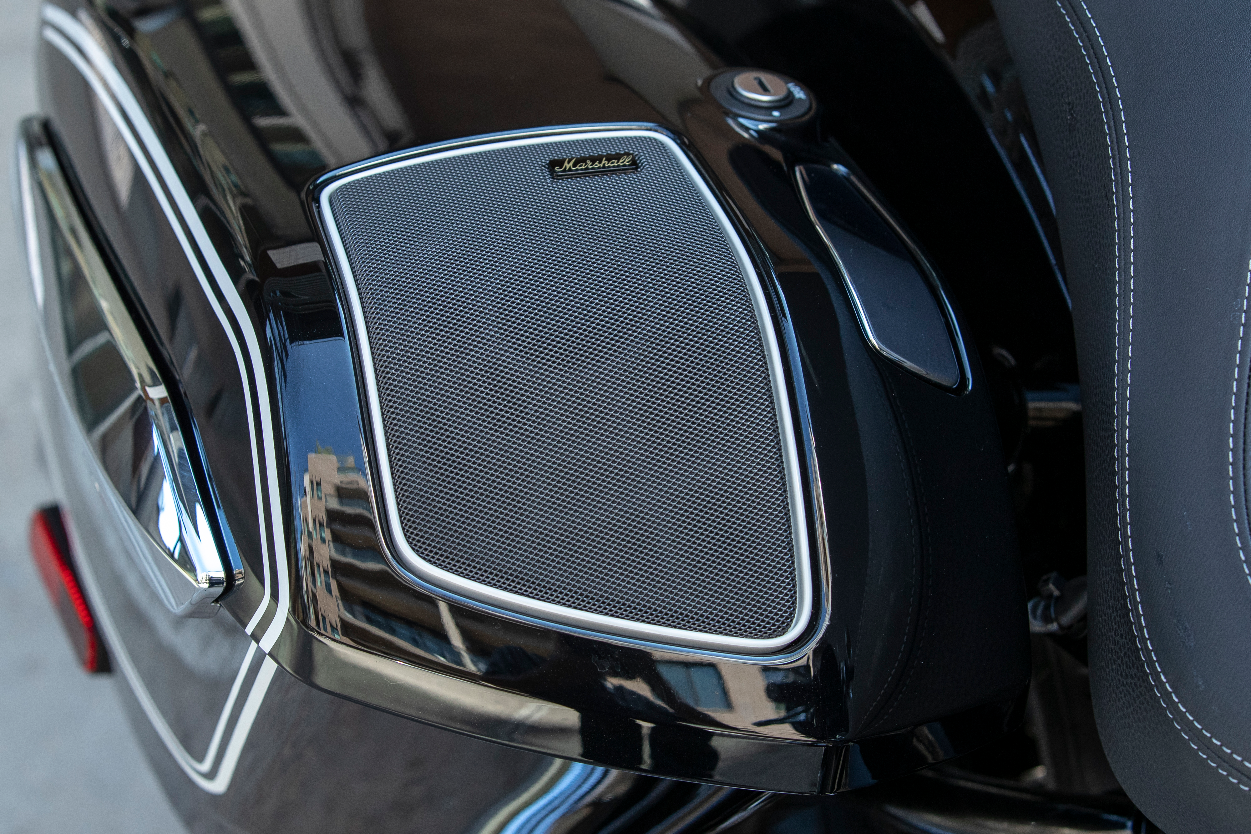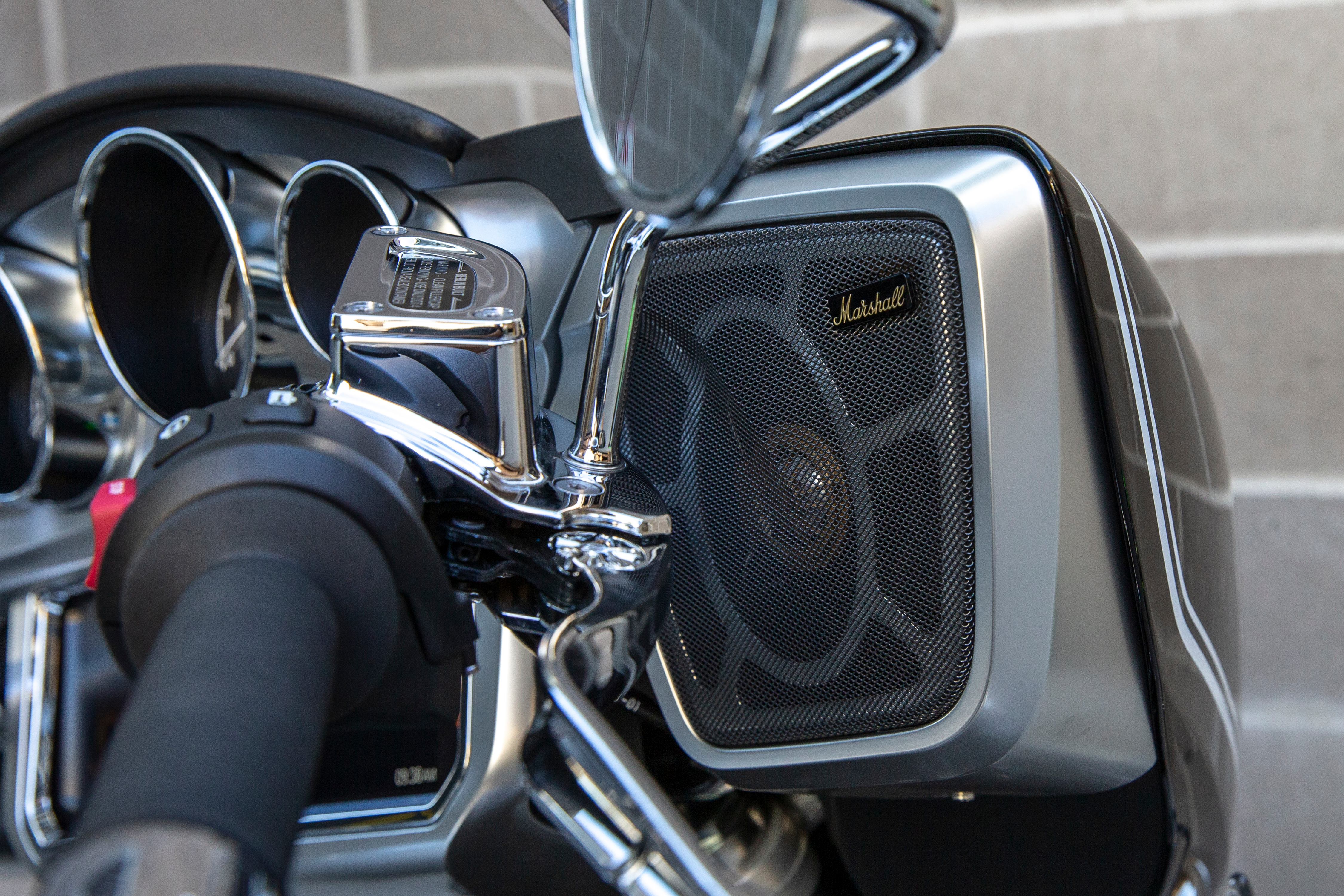 Music is handled by a sound system designed with Marshall. The standard system features two 25-watt speakers mounted into the fairing.