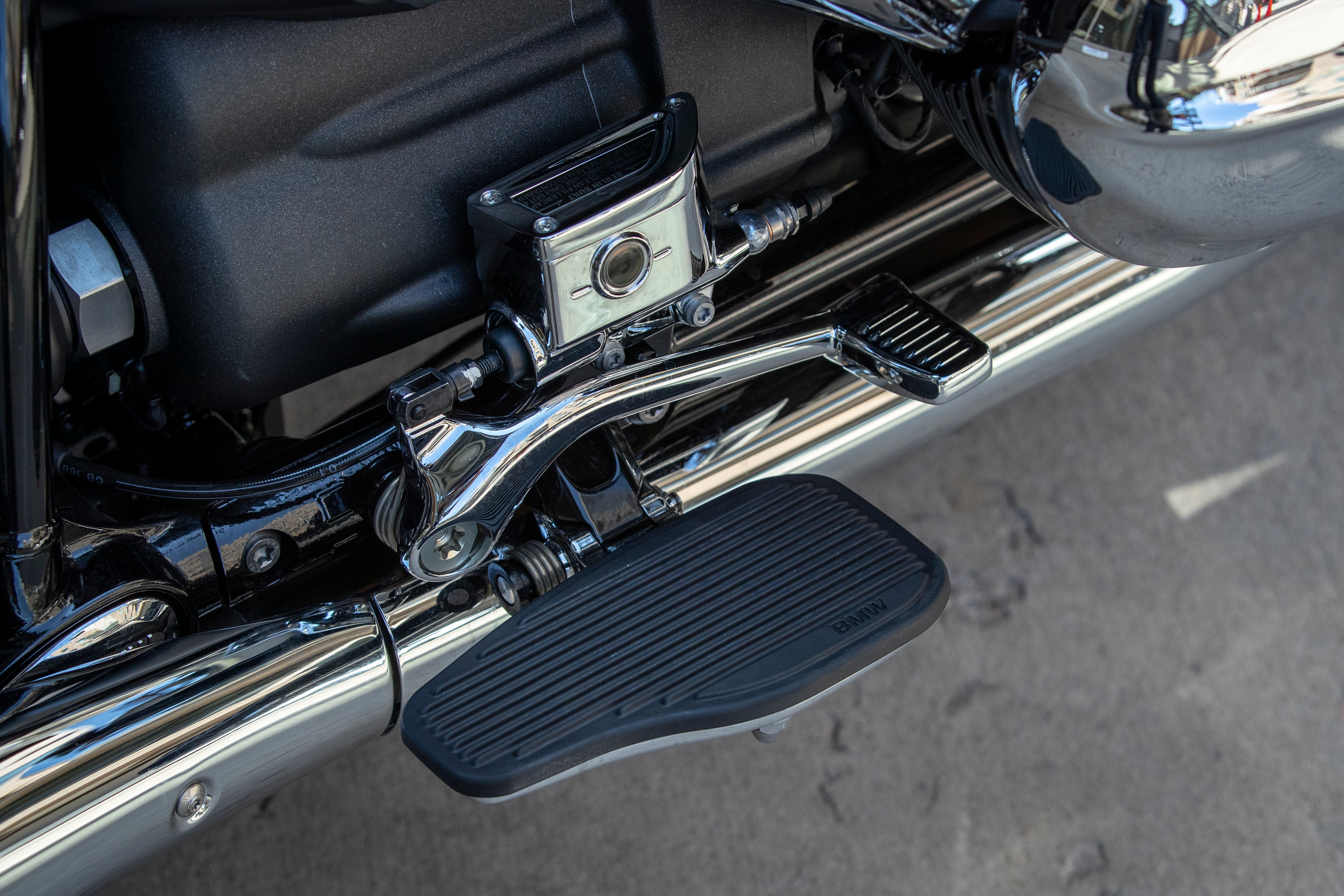 These bikes weigh a thousand pounds or more with a rider and you do feel it at slow speeds. BMW changed the profile of the R 18's frame for the R 18 B and Transcontinental so that the forks sit behind the steering head instead of in front of the steering head as in the R 18. BMW says that this offers better stability while cornering and hides some of the weight during low-speed maneuvers. The frame is also reinforced in key points as these are designed to carry more weight.