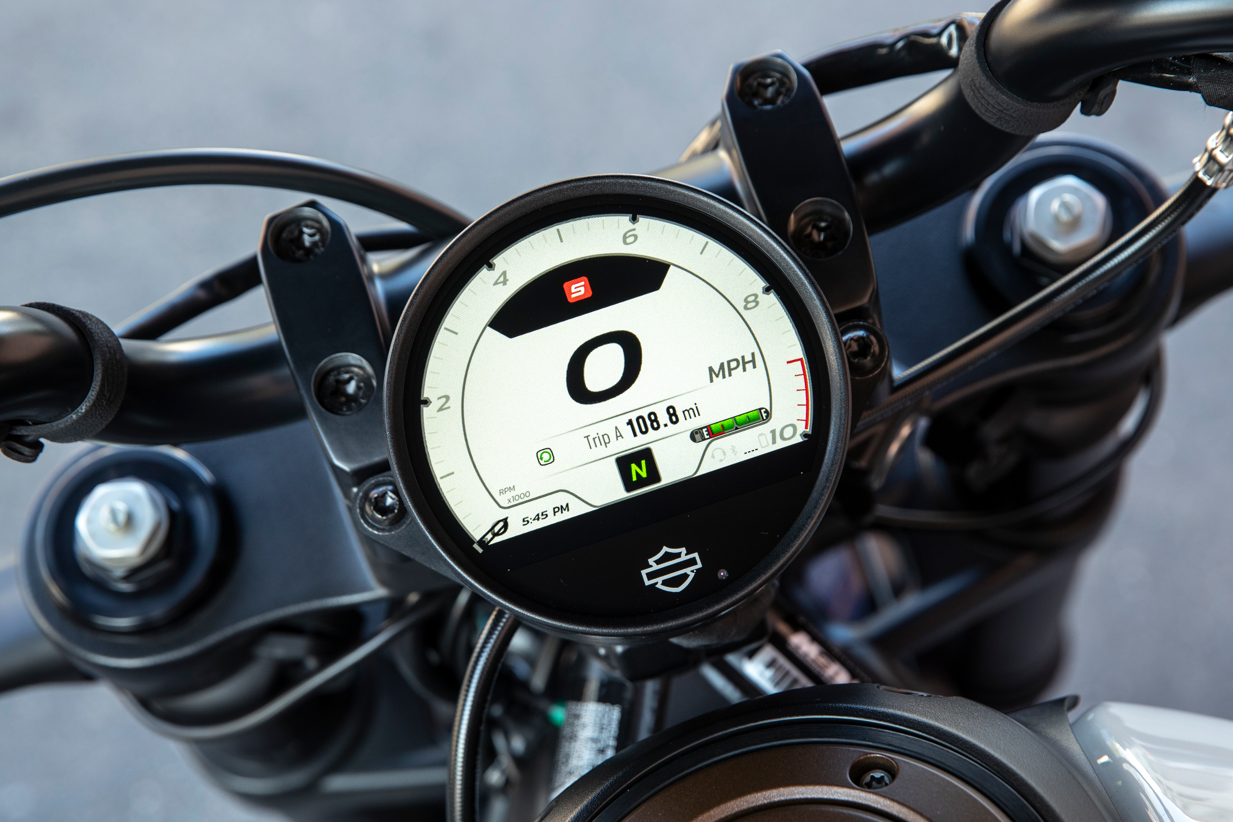 The new thin-film-transistor LCD display is as gorgeous as it is informative. The small round display plays all the hits, providing a large digital speed display in the center surrounded by a sweeping tachometer hand that is easy to read at a glance thanks to the area behind the sweep filling in with red as the artificial needle moves around the outer perimeter. It's such a great look, and it works great. Consider me a fan, and this display should be on all of Harley's bikes in the future.
