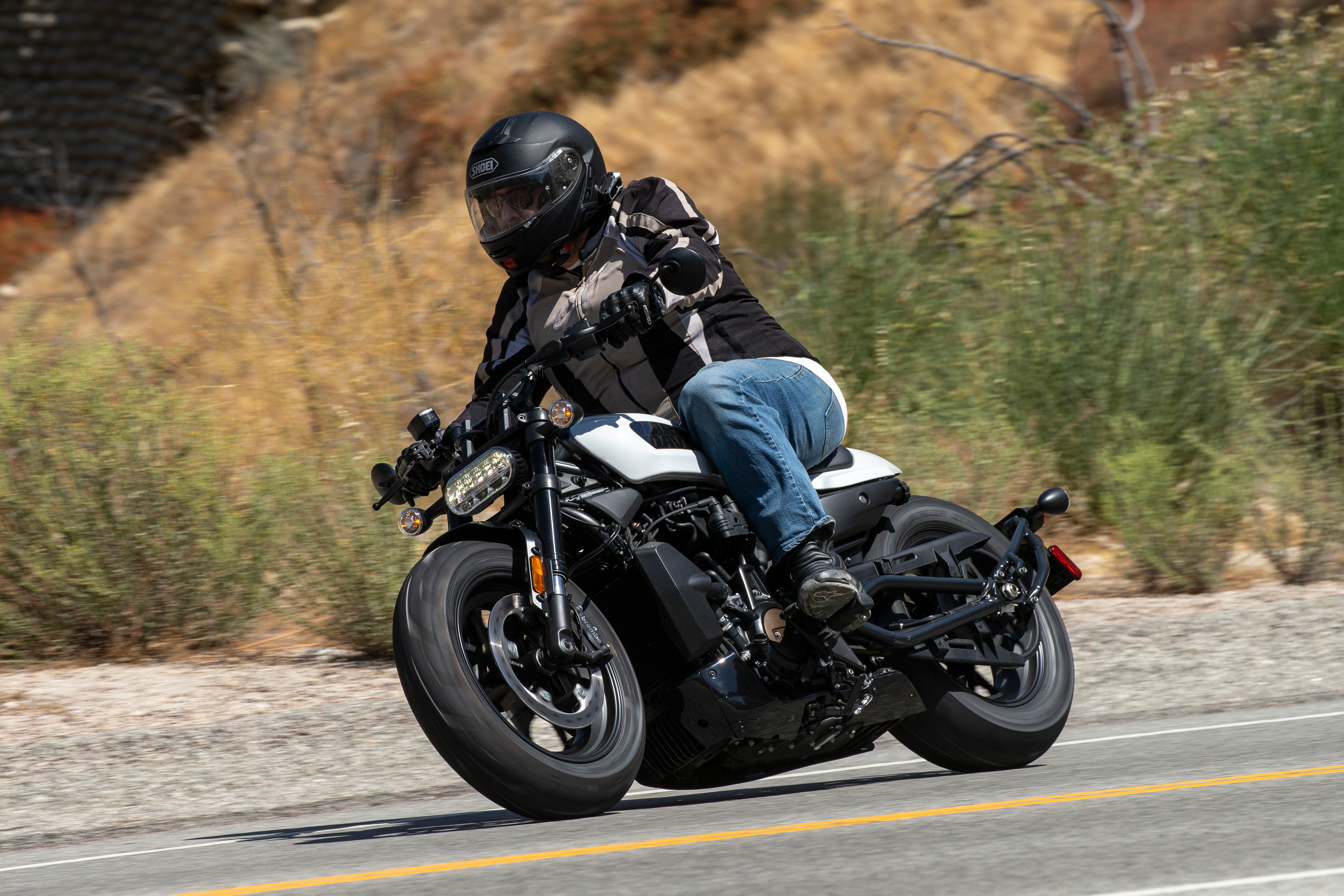 The bike has a ton of grip with such big tires. Sure, that big front rubber makes turn in a little plodding, but the predictability and stability through every phase of the corner is unmatched. The co-branded Harley-Davidson Dunlop GT503 tires are sized 160/70-17 in the front and 180/70-16 in the rear, making for a big chunky look and big chunky feel. Grip grip grip everywhere. And you need it, because the bike now sports 34 degrees of lean angle, compared to the 28 degrees on the former Sportster models.