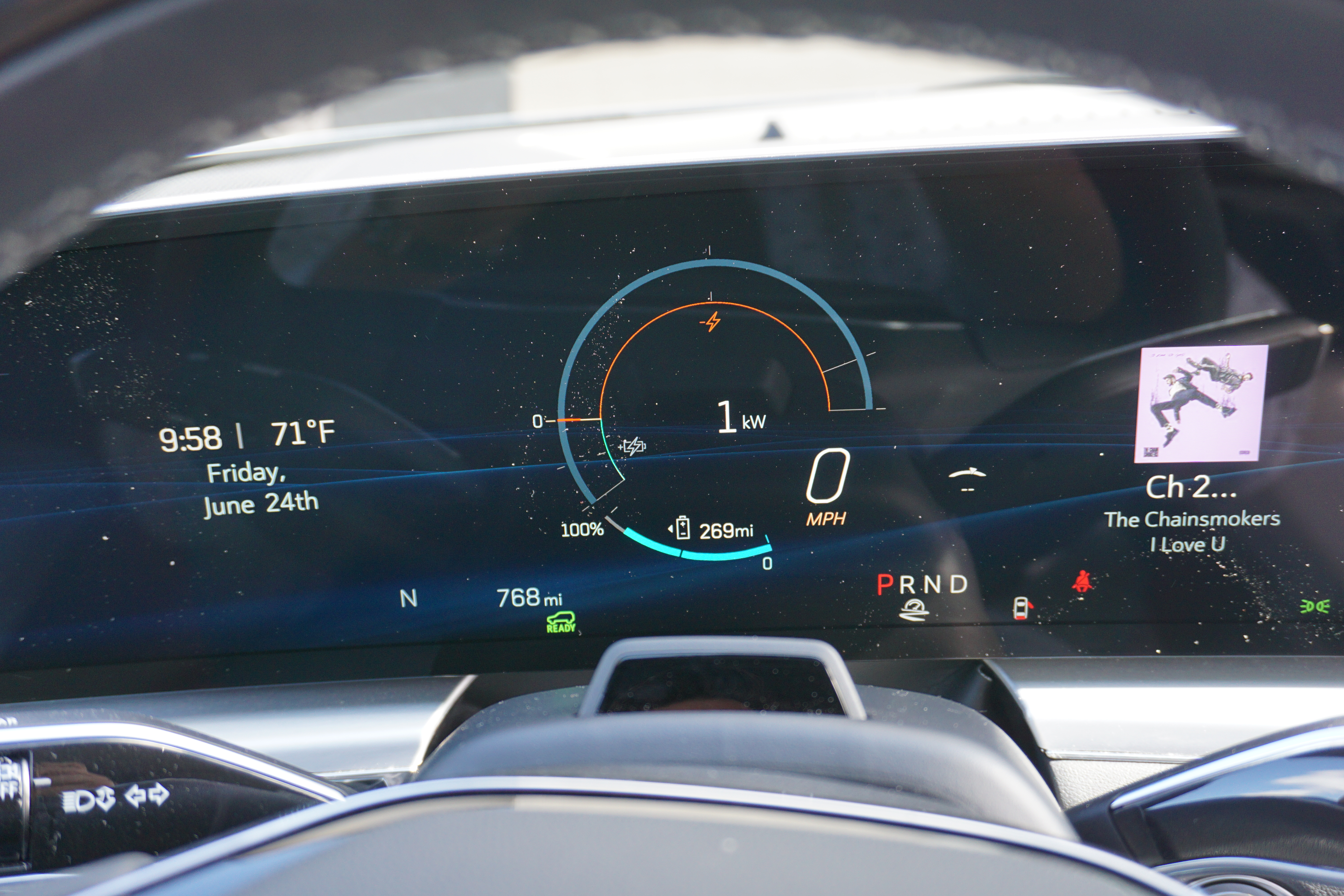 The 19-speaker AKG audio system sounds very good to my untrained ears,. Being an EV, the noise floor is incredibly low. You barely hear any road noise as you drive along — thanks in part to active noise cancellation, and in part to the inherent near-silence of an EV drivetrain.