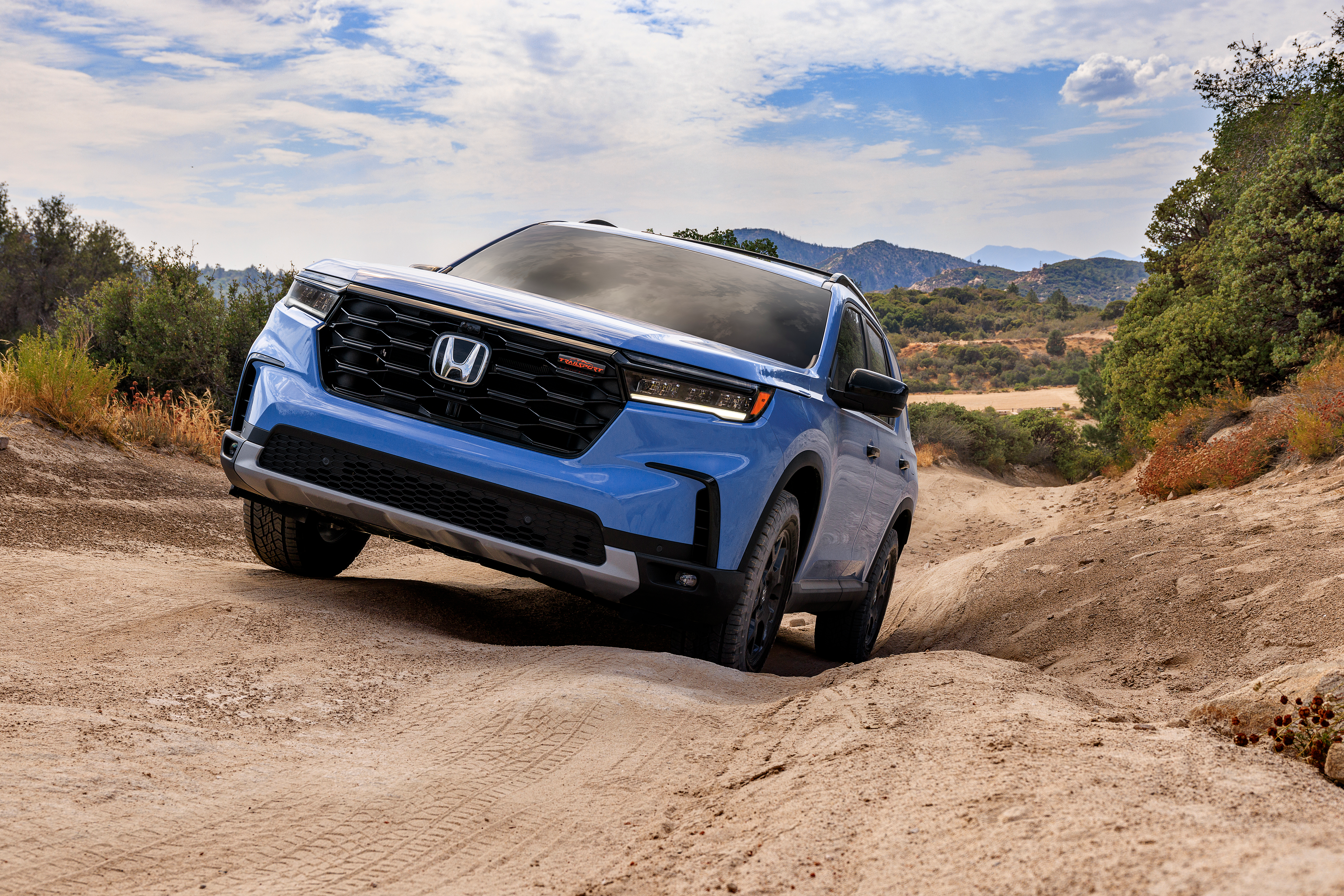 TrailSport is the biggest news in the Honda lineup — introduced last year on the third-gen Pilot and upgraded with more capability on the 2023. Starting at $49,645, it comes with off-road suspension with an inch more of ground clearance, steel skid plates, 18-inch wheels with all-terrain tires, an off-road camera called TrailWatch and an exclusive exterior color Diffused Sky Blue.