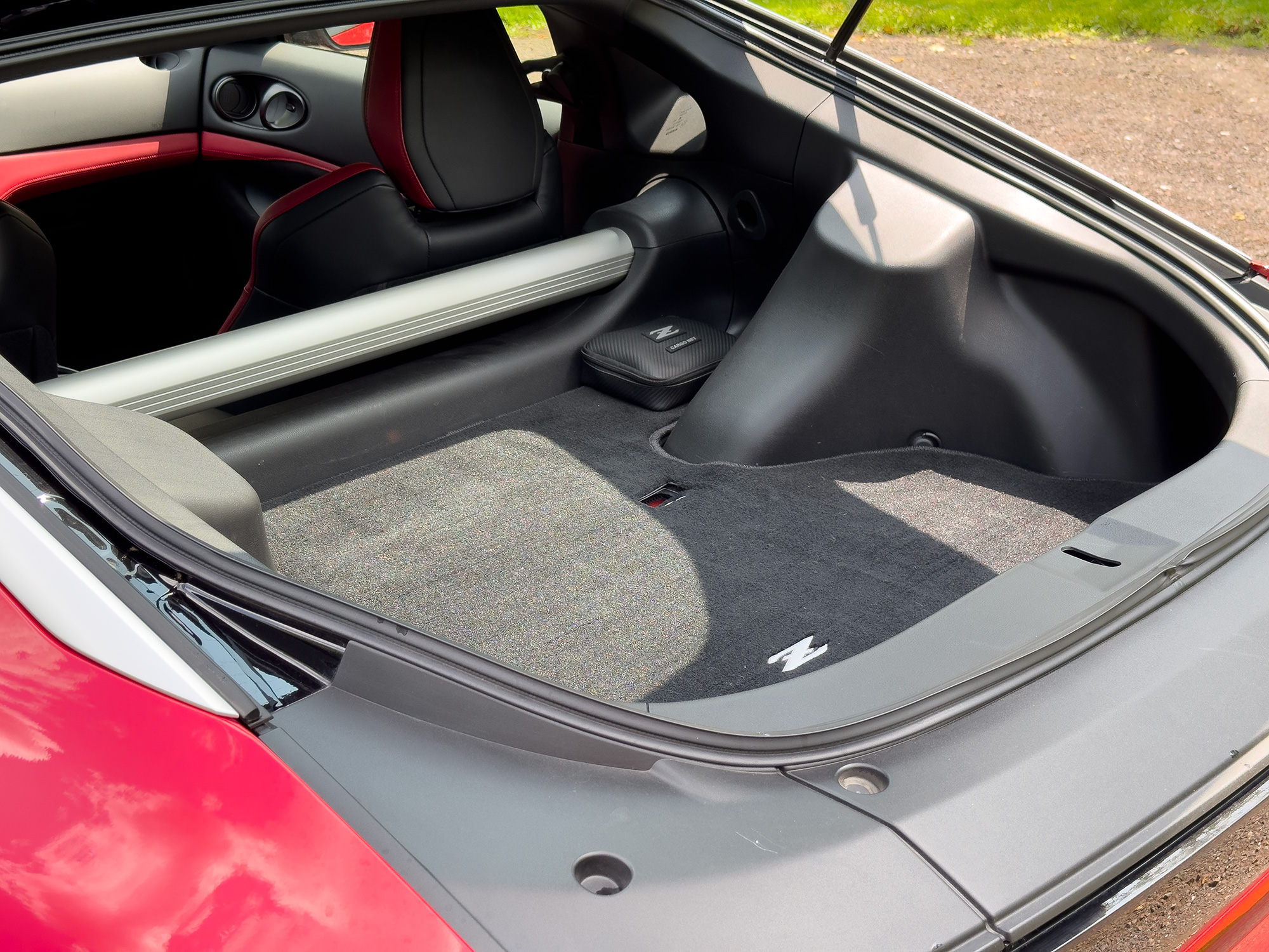 When you do, you'll probably wish the Z used its interior volume a little more efficiently. Yes, this is a two-seat sports car, and so any expectation of packaging competence is probably misguided. Still, the floor behind the liftgate is very high and flat, so much so that more than one bag of carry-on luggage could make for a tight squeeze. Thankfully, there are small cubbies behind each seat, and they're great for holding a bag or two of groceries each.