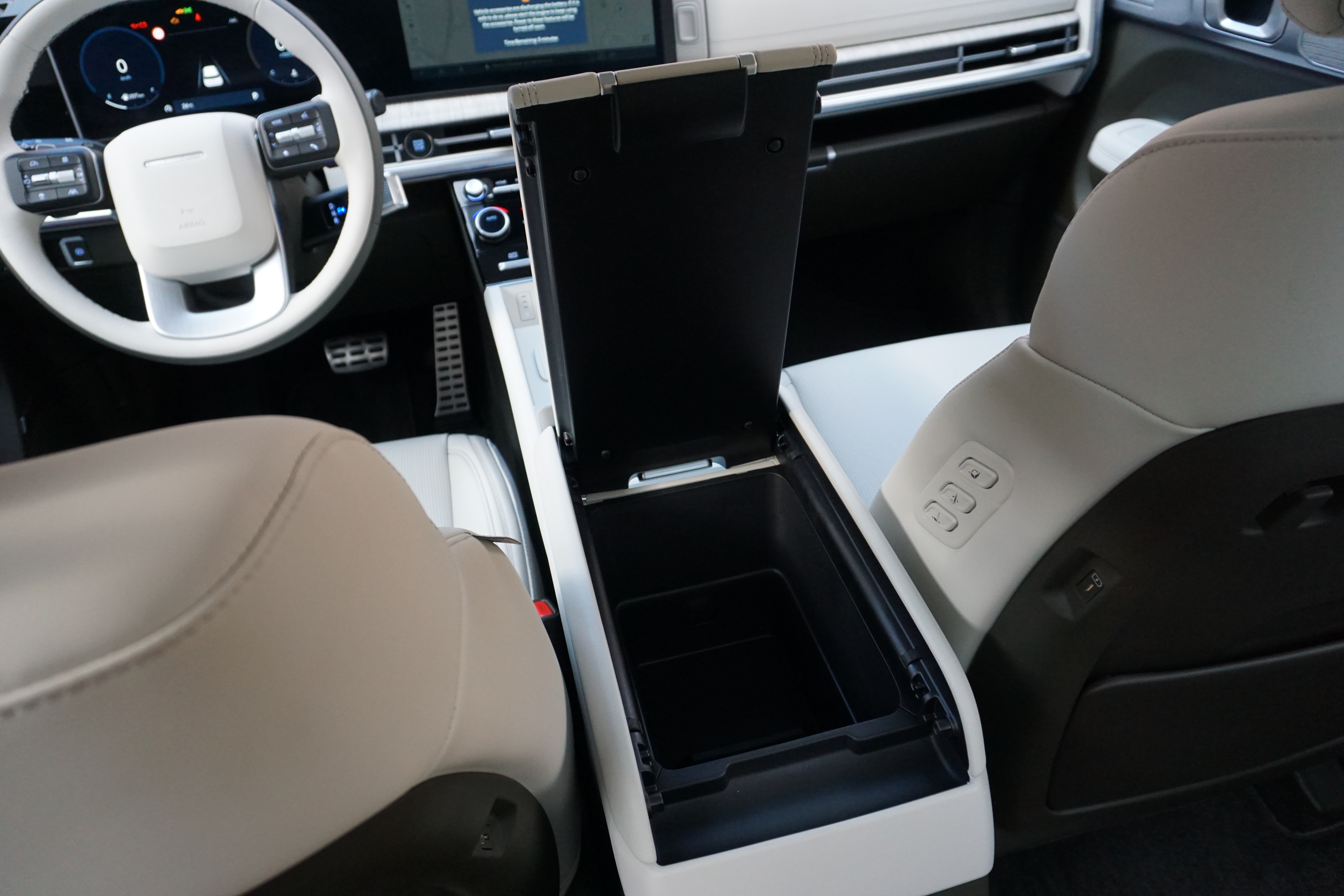 Hyundai put a very interesting touch to the center console where it's double-hinged, but not side to side. No, no dear reader — it's hinged at the front and back. That means you can either grab something you need when it opens to the front, or it can open to the rear so rear passengers can also dig through the endless cubby for whatever anyone may want or need.