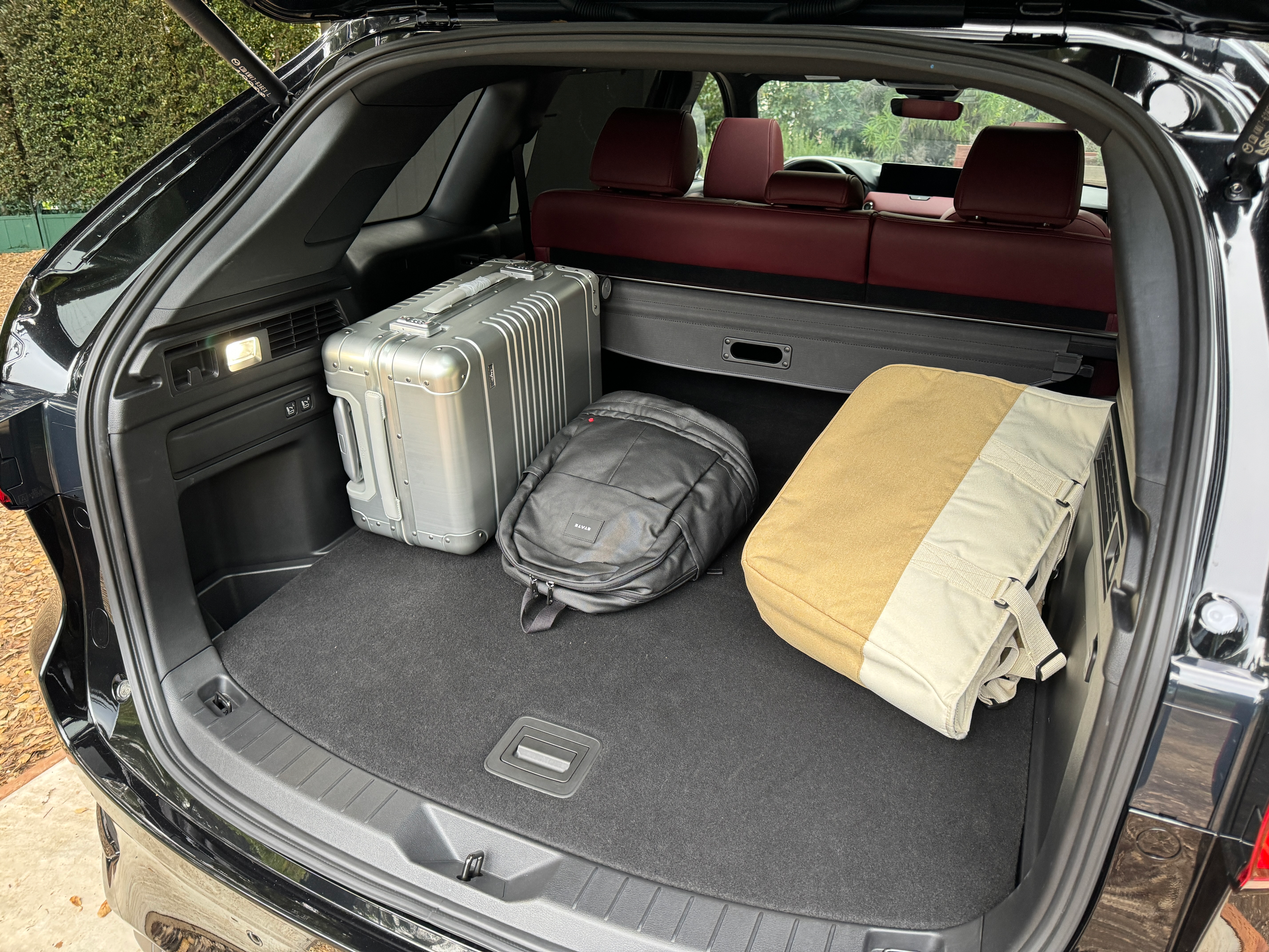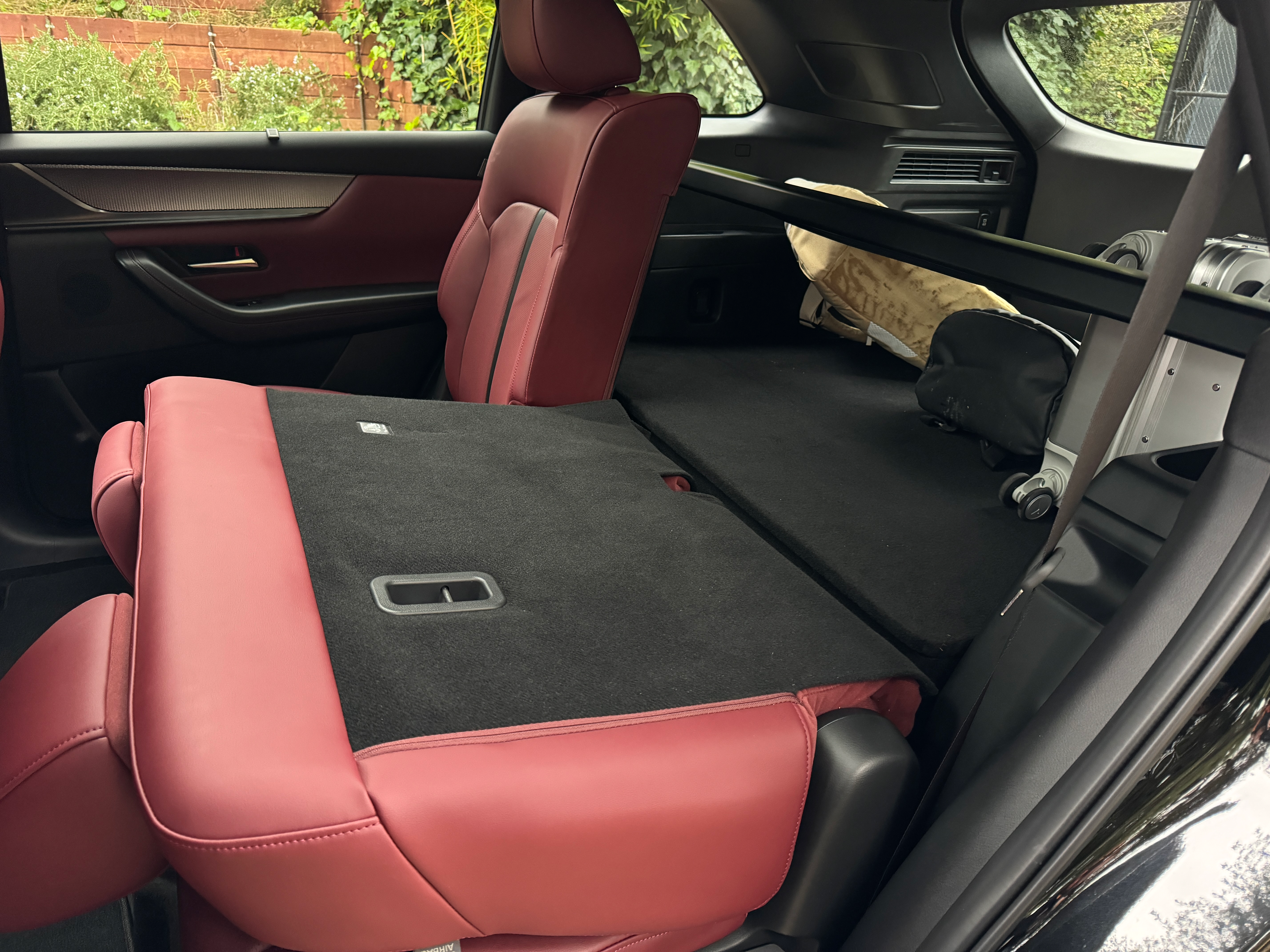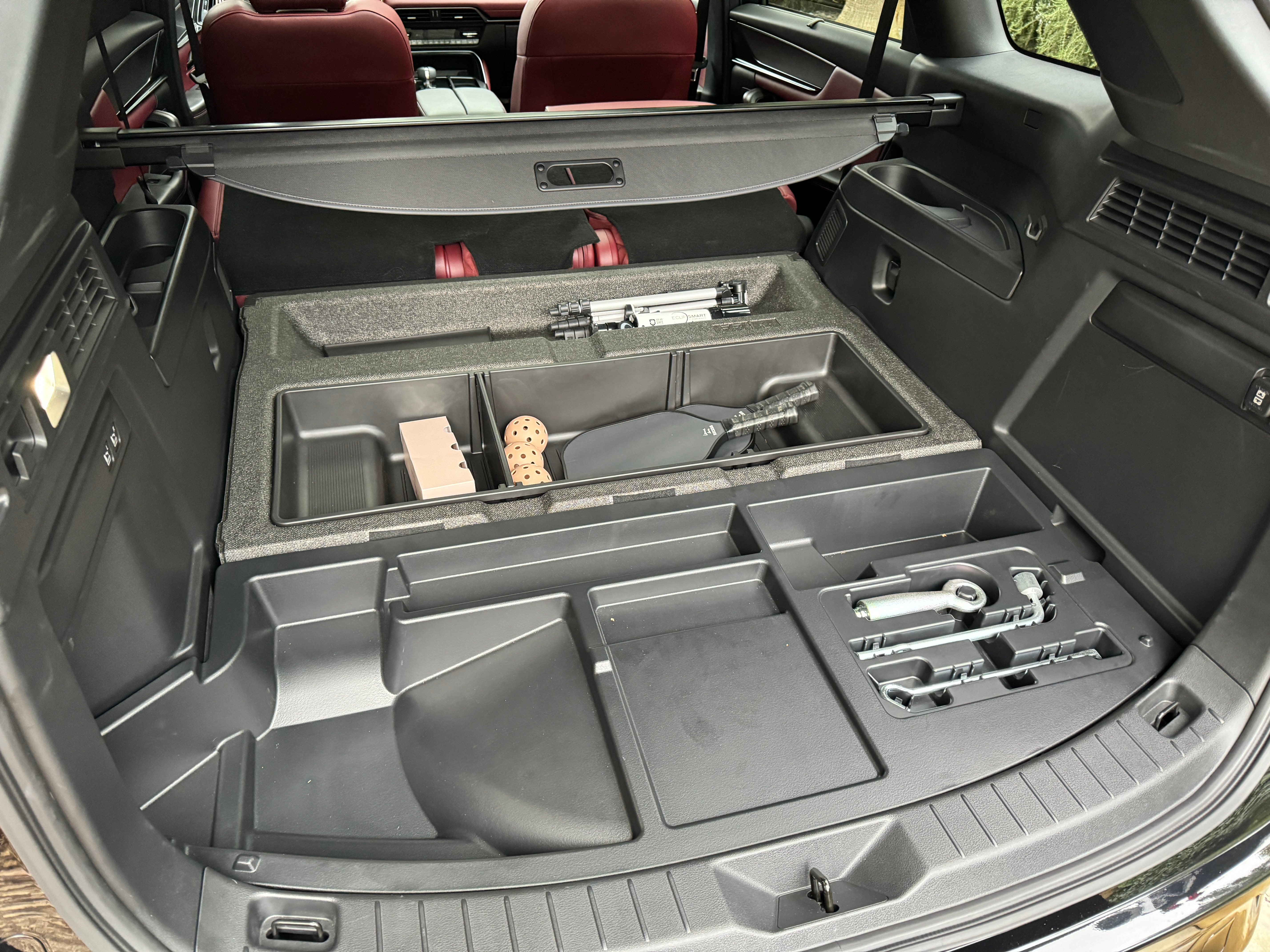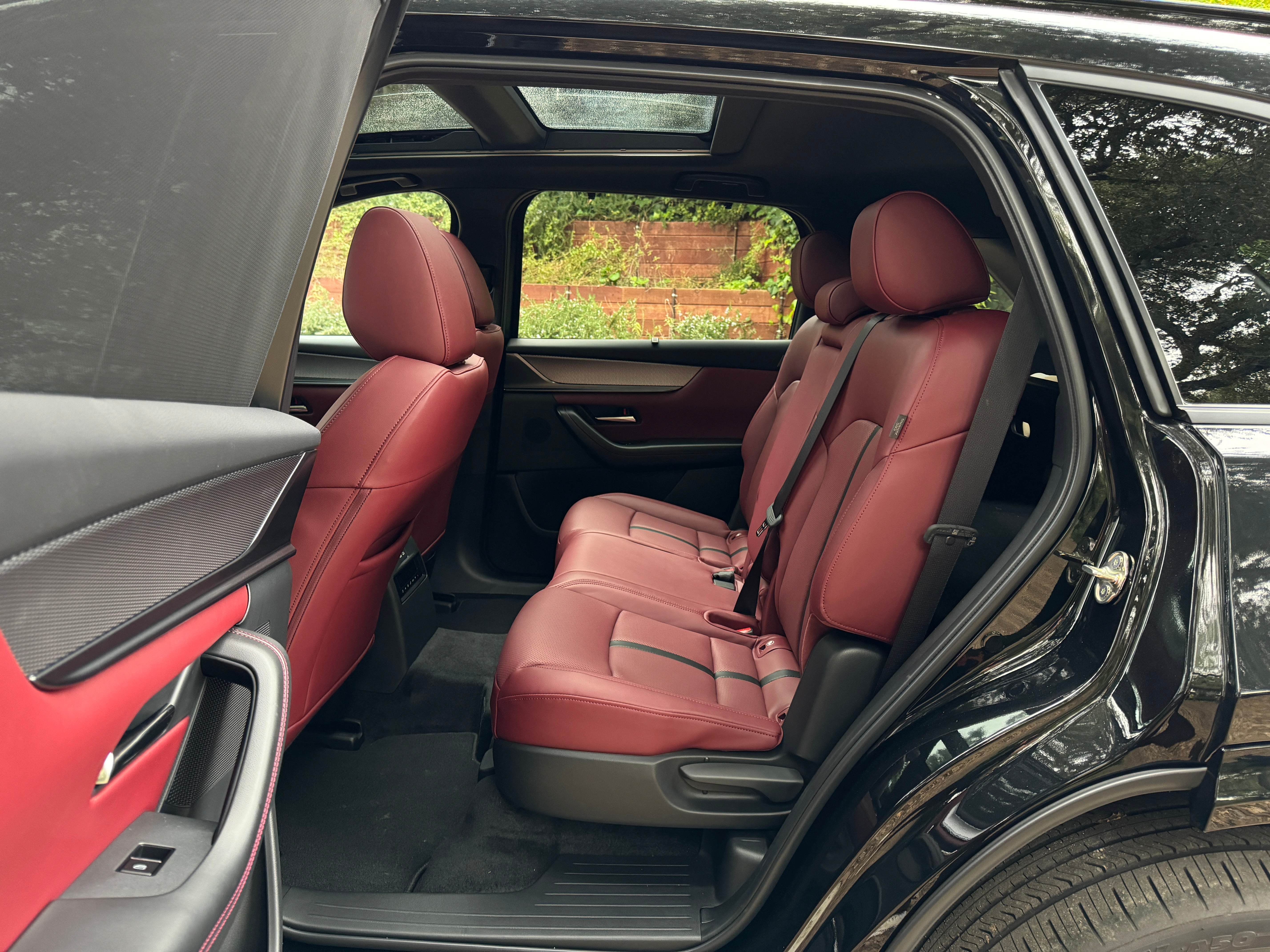 It's even stranger when you hop inside. Aside from a new red leather color and the lack of the CX-90's standard third row, the CX-70's cabin is also identical to the CX-90. Mazda didn't even push the second row back or redesign it to give rear passengers more space. Using buttons in the cargo area the second row power folds to create a flat floor, and underneath the cargo floor cover are removable storage boxes with dividers that can fit a lot of stuff. Mazda says the moldings around the rear wheel wells are flatter to give more space, but the difference is extremely minor.