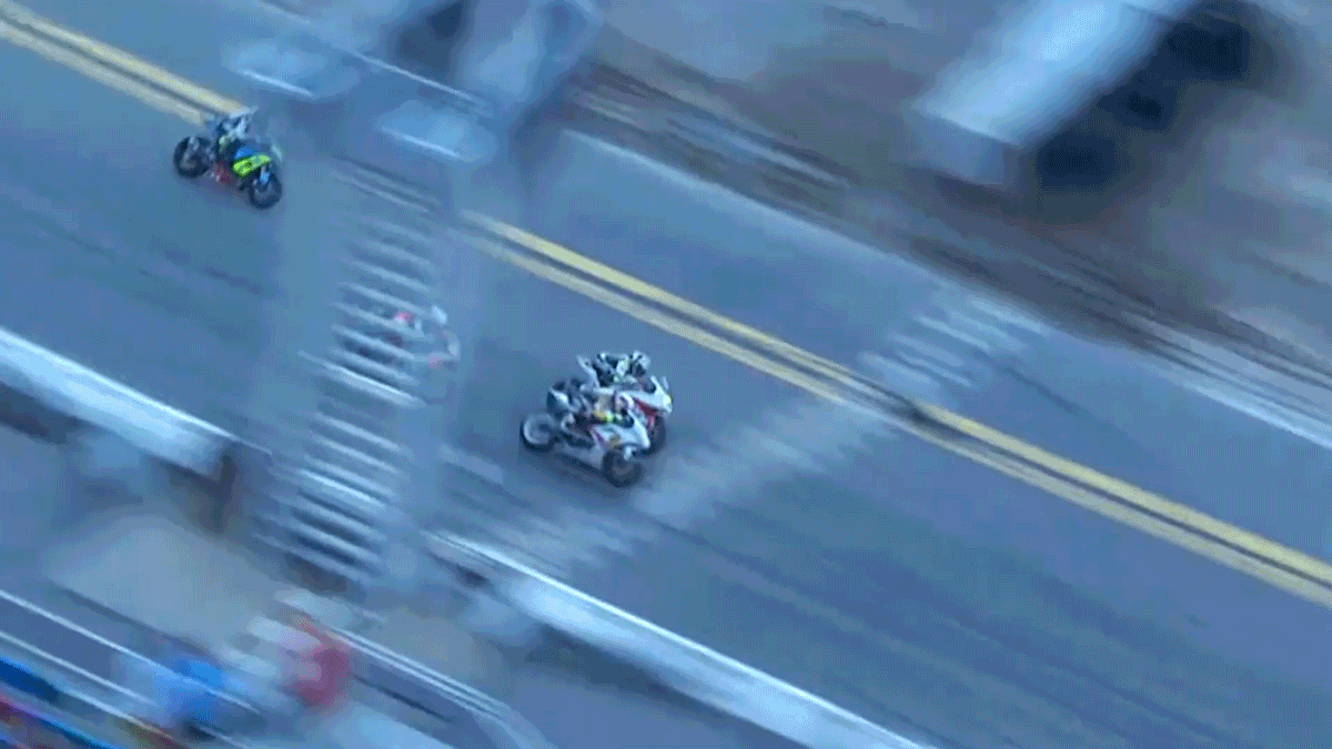 On the eighth lap of the 57-lap race, the race was stopped with a red flag. Jose Lloreda lost control of his bike on the exit of the bus stop chicane. He fell off the bike as it continued out and smashed into the SAFER barrier in NASCAR turn 3. Lloreda was okay, but the destroyed bike scattered debris across the track. I always hold my breath when I see sportbikes racing around Daytona. The high-speed pack racing right up against the speedway walls means that one mistake could lead to a massive incident involving multiple riders.