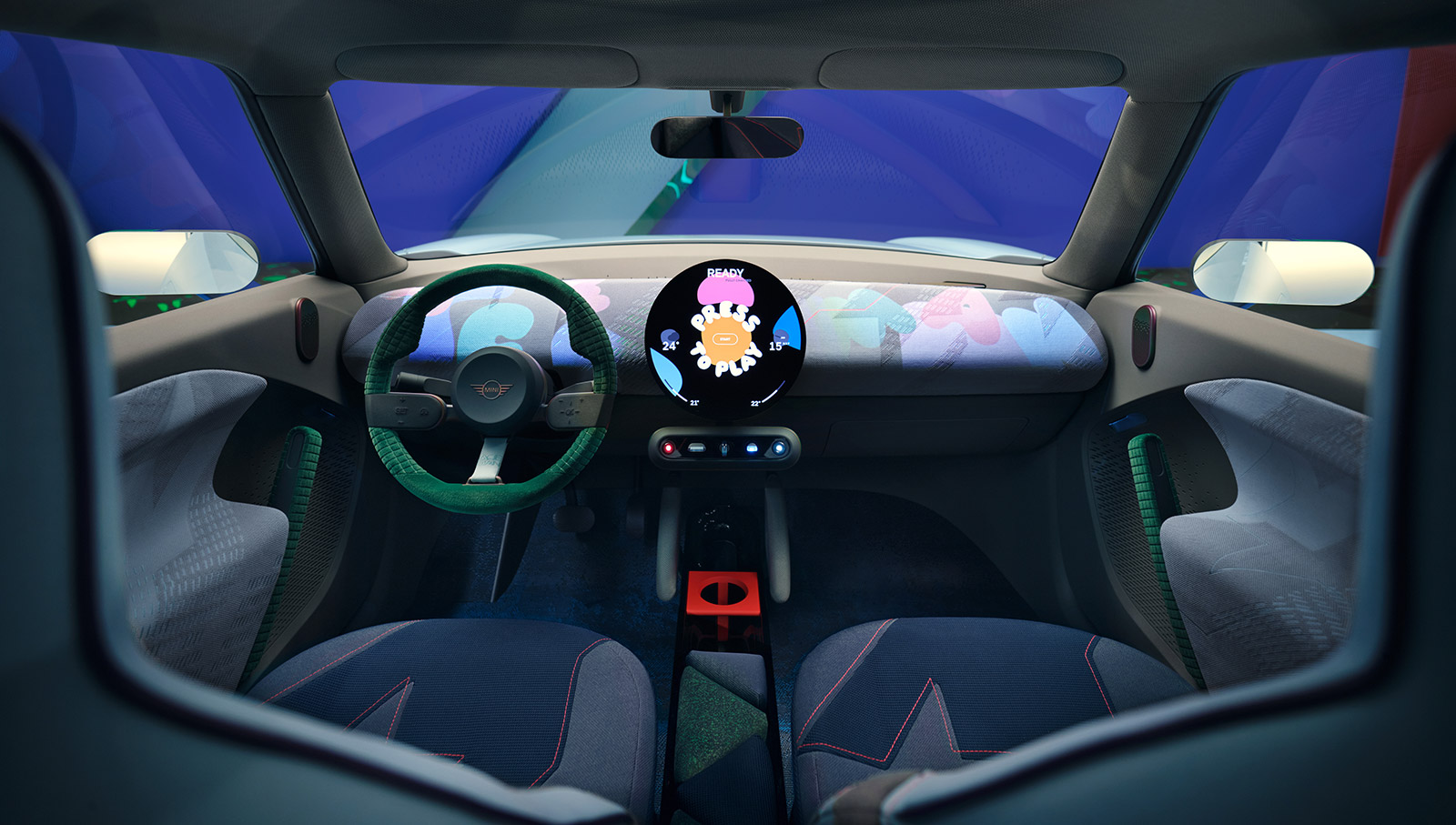 At the center of the dash is the classic Mini round display. It's amusing to think that this used to primarily be a speedometer; it's now an OLED screen with an infotainment system running on Android. The mix of pastel-toned words and shapes visible on the dashboard actually originate from an overhead projector. Mini seems very proud of this system, devoting multiple paragraphs to how it can be customized in the brand's own press release, though it's hard to imagine anything so distracting making it to the eventual production Aceman.