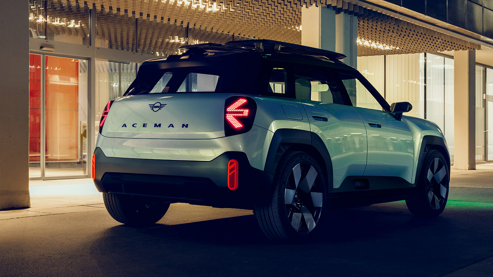 First off, yes — it's a crossover. Not quite as large as the Countryman, which is about 10 inches longer, though similar in every other dimension, the Aceman looks like a Mini for the EV age. The wheels are pushed out to the absolute fringes of the body, the cladding encircling them is boxy and matte black, and there's a geometric theme to the haunches and cut lines that builds on what's come before, but conveys a more futuristic aesthetic.