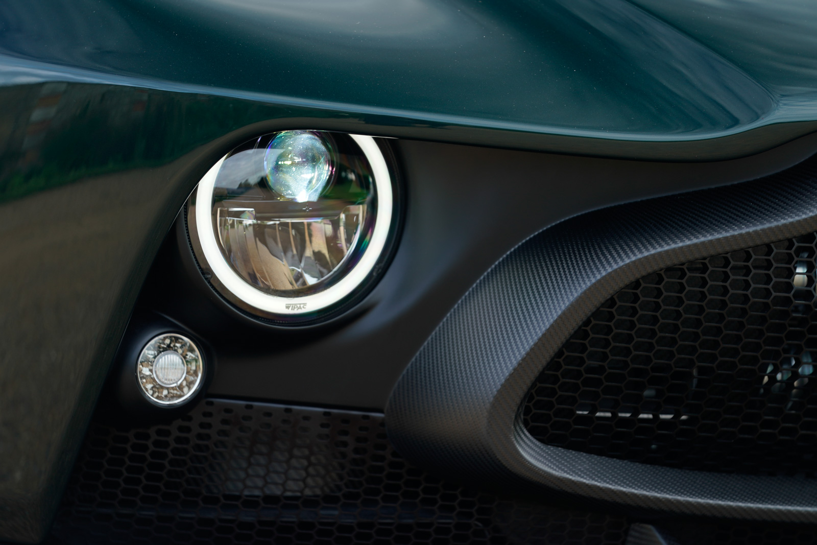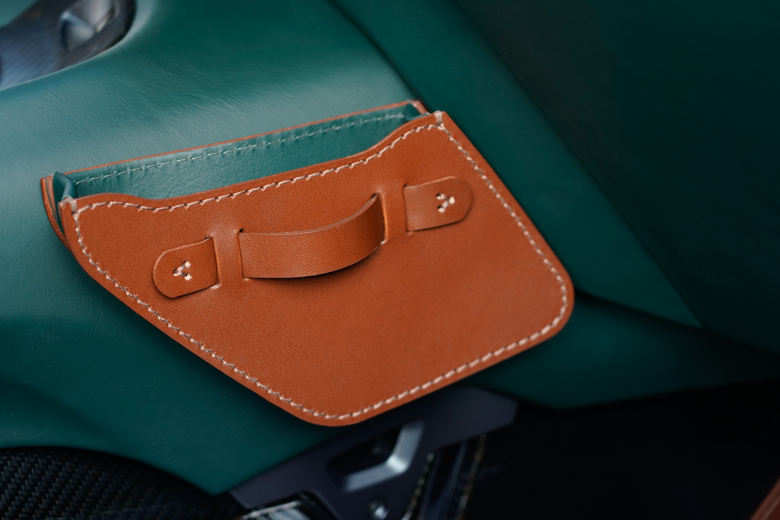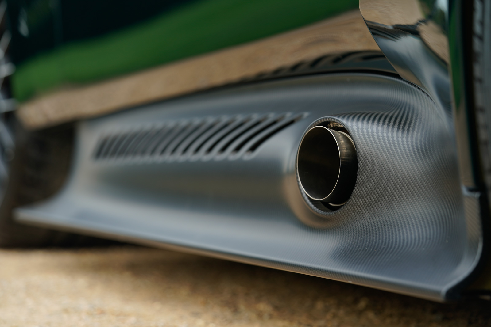 Finished in "Pentland Green" and satin carbon fiber with a Forest Green interior sewn by fancy leather outfit Conker Bridge of Weir which used cashmere on the headliner. Also: The solid walnut(!) dashboard is Crown cut, whatever that means, and matches the wood shift knob.