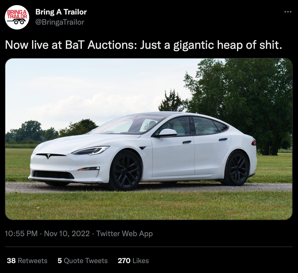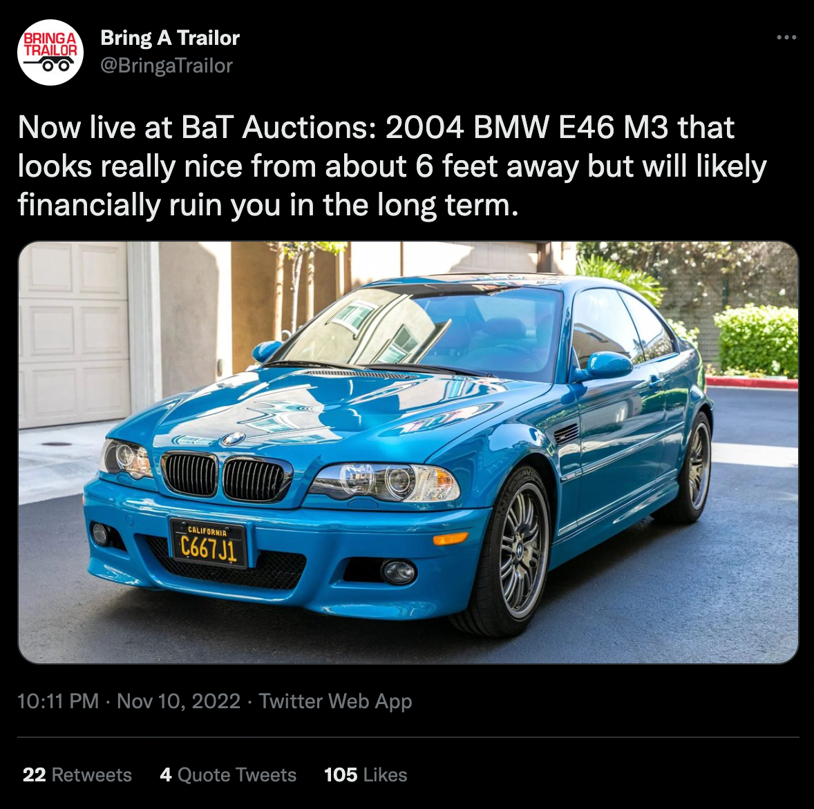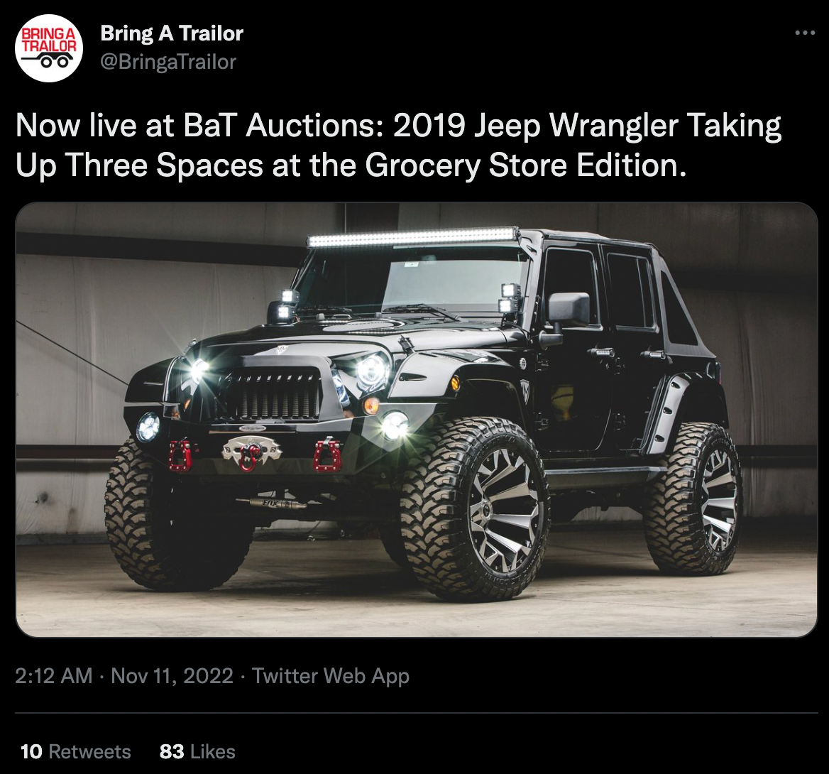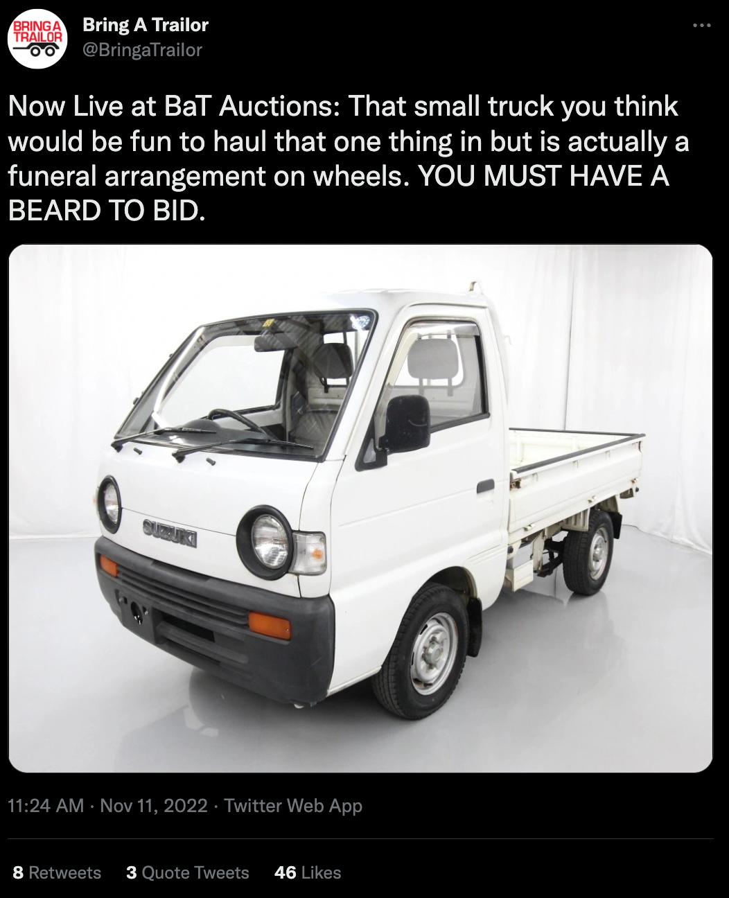 In this chaotic week at Twitter, there have been plenty of bangers, but the one account that really caught our attention in Slack this week, is user @BringaTrailor. The account, down to the logo, looks a hell of a lot like Bring A Trailer's actual Twitter page, but all of the posts are very fake and very funny. The only glaring difference, other than the brutal honesty of the ads, is the very sneaky change of the "e" to an "o" in the name. So, let's take a look at some of the best fake ads 'Bring a Trailor' has to offer (via screenshots in case the account suddenly disappears... .)