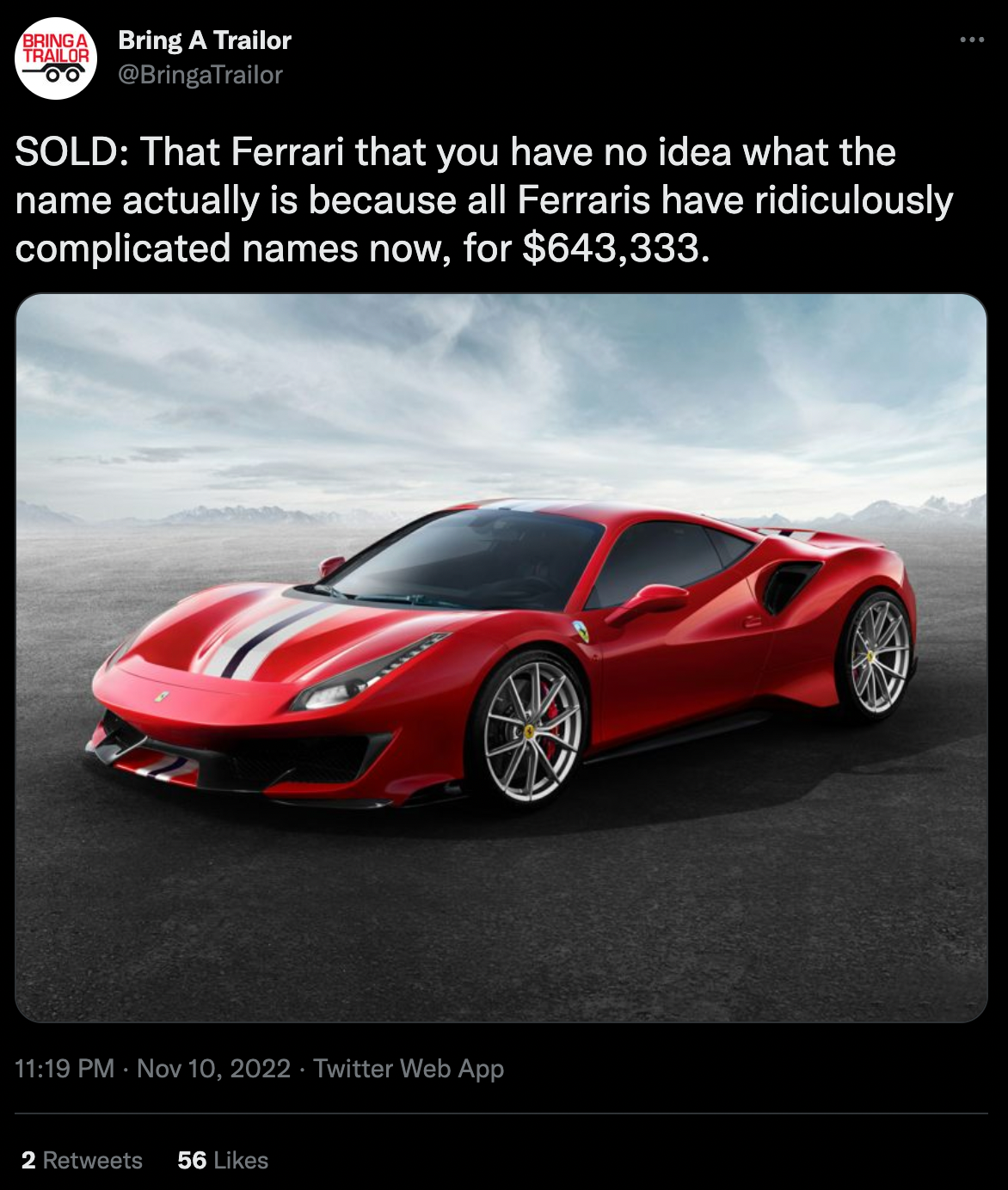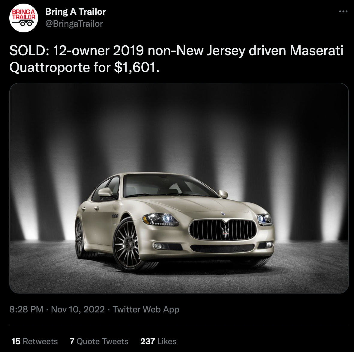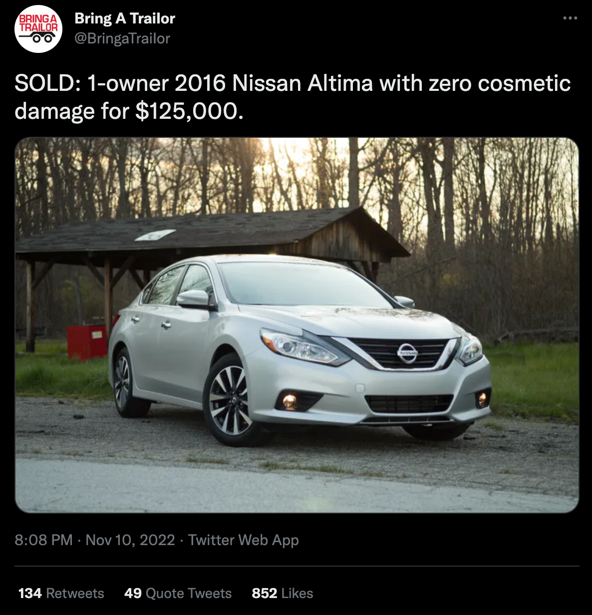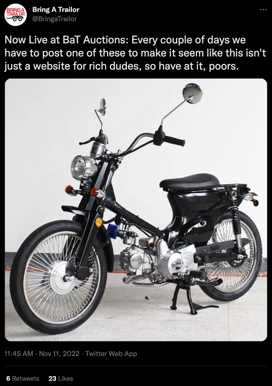 In this chaotic week at Twitter, there have been plenty of bangers, but the one account that really caught our attention in Slack this week, is user @BringaTrailor. The account, down to the logo, looks a hell of a lot like Bring A Trailer's actual Twitter page, but all of the posts are very fake and very funny. The only glaring difference, other than the brutal honesty of the ads, is the very sneaky change of the "e" to an "o" in the name. So, let's take a look at some of the best fake ads 'Bring a Trailor' has to offer (via screenshots in case the account suddenly disappears... .)