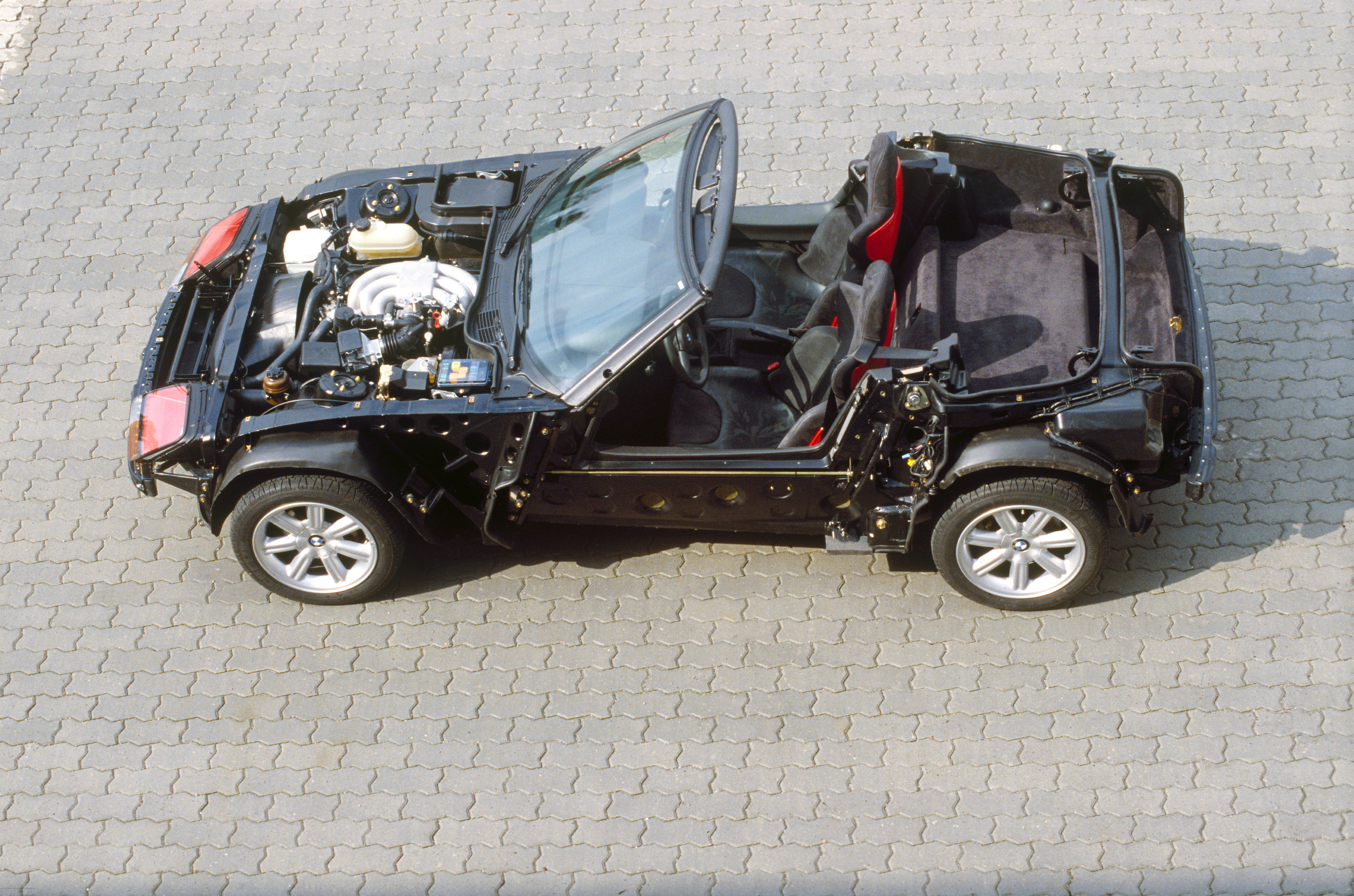 What was (other than the doors, and that you could drive around with them down) was that the body panels weren't exactly structurally integral to the car. You could drive around without them on if you wanted. Many a development engineer did, by the looks of the photos that BMW's historical archive sent me.