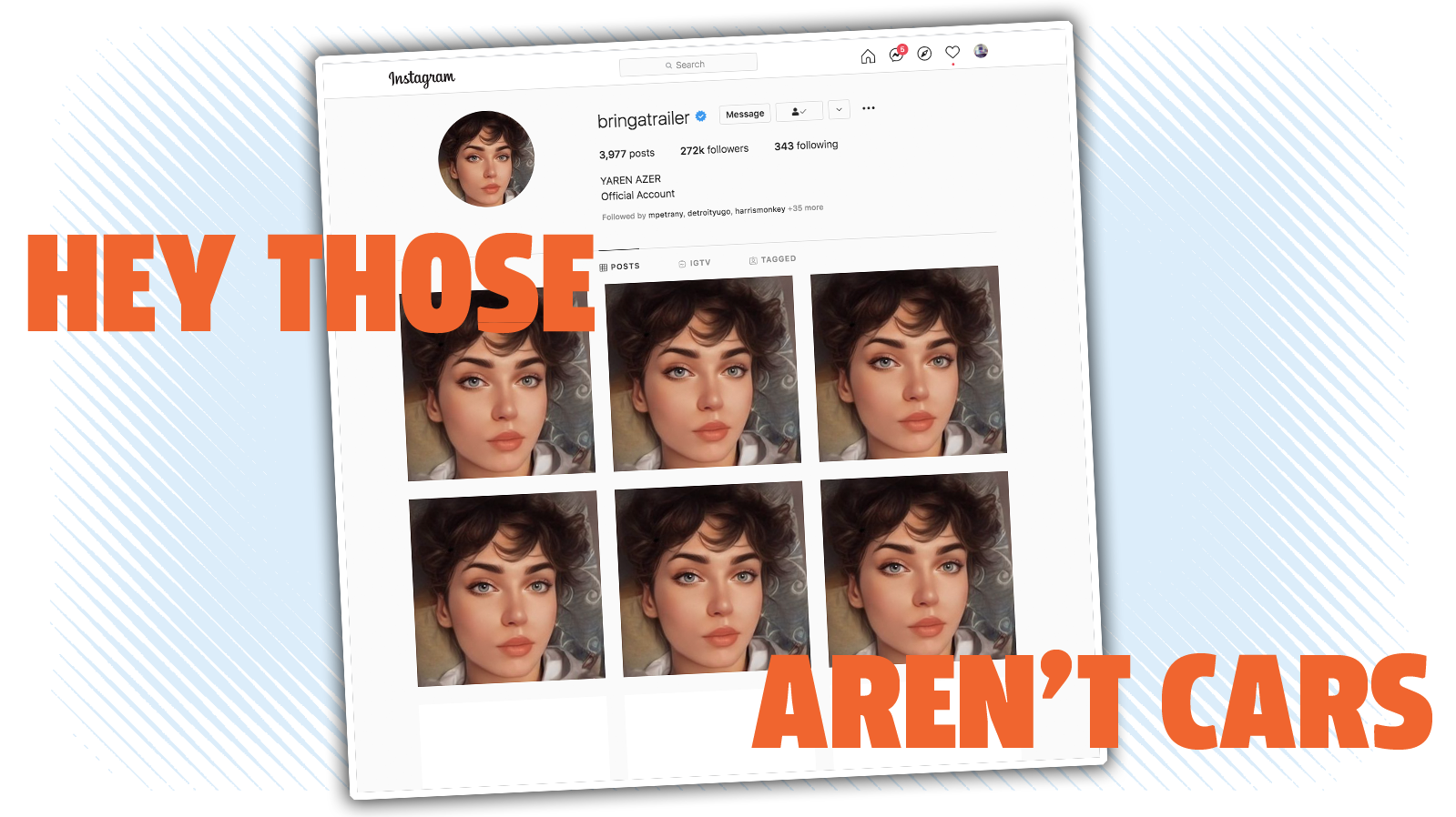 Fans of the site responsible for making all of the shitboxes you coveted as a youth wildly unaffordable today, Bring A Trailer, appears to have had its Instagram site hacked today, or perhaps the car-sales site is making a move into the lucrative Turkish TikToker fan space, since the Instagram page now seems to be exclusively pictures of Turkish TikTokker Yaren Azer, and was previously full of pictures of Elif Armağan, another Turkish TikTokker with 150,000 followers and a penchant for cat's-eye style eye makeup.