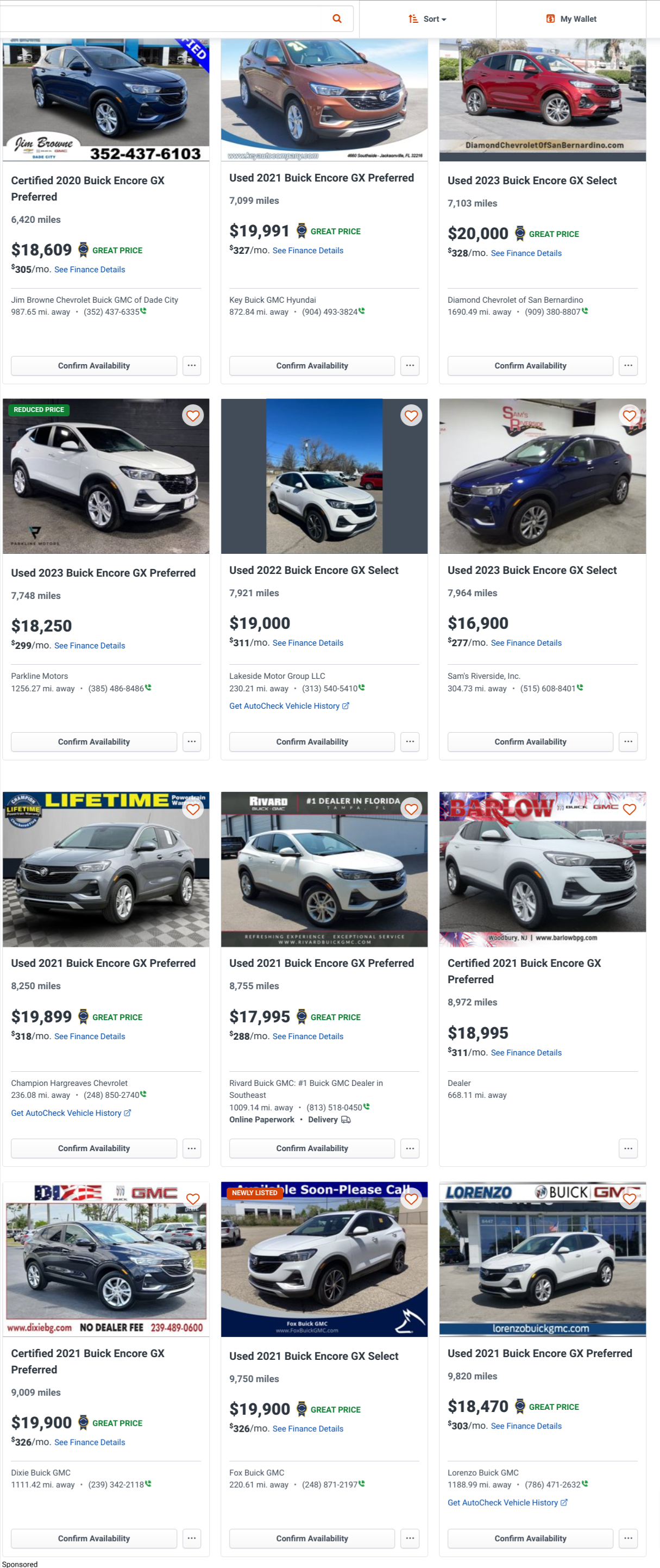Recently, I helped two clients who were assisting their kids with car purchases. The requirements were for a small, reliable car loaded with safety tech and some warranty balance in a budget range between $20,000 to $25,000. Of course, there were the usual choices from Honda, Subaru, and Mazda, but due to the slim depreciation curve of these Japanese models, it was hard to find cars with much warranty balance, especially on the lower end of that price point. In both cases I recommended the Encore GX knowing full well that a college-aged driver probably isn't going to be too jazzed about driving a Buick. To my surprise, the Buick ended up being the favorite car amongst the list, and we found some pretty excellent deals for both clients.