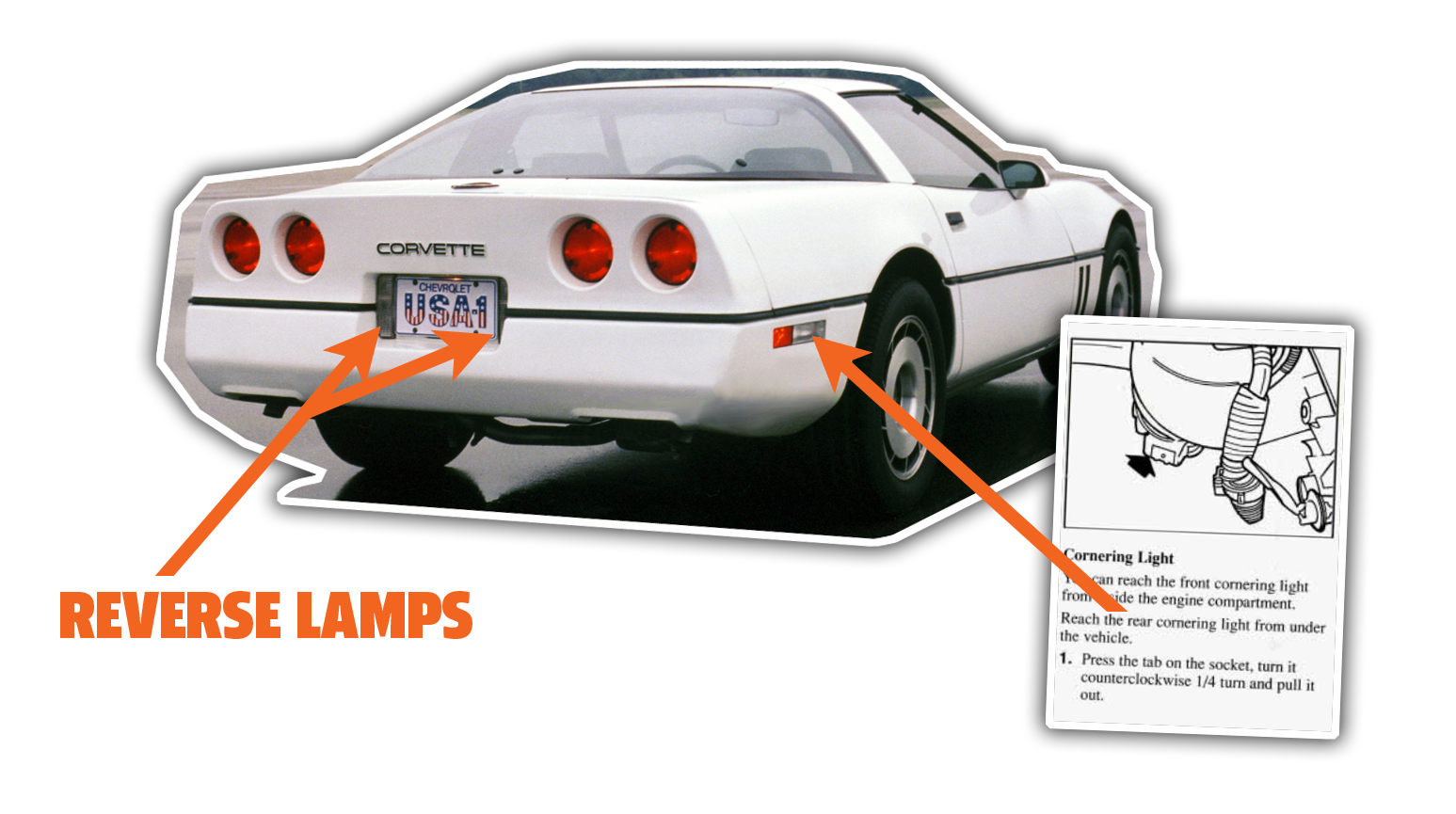 Let's start with the reverse lamps, and I think you're going to be surprised and delighted, perhaps to the point of a spit-take or an involuntary quick spurt of urine, so you've been warned. Look at this image of the side of a C4 'Vette, and note the lighting:
