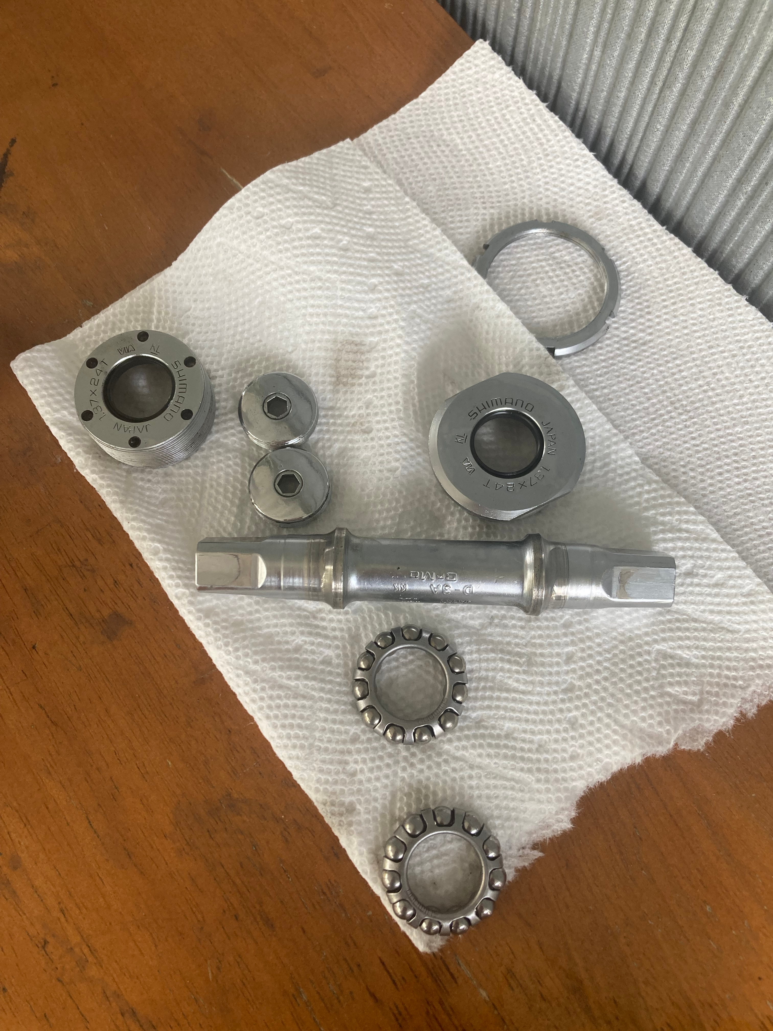 This BB-M730 works in the same way. There is an axle (a "spindle") that your cranks attach to, and it is suspended on bearings on either side of the bike. Rather than keep these bearings sealed away in cartridges, the BB-M730 leaves them exposed. You keep them smooth and sealed with fresh grease. As for adjustment, they must be held snug but not too snug. They must not be pressed so tightly that they don't spin, but they can't be so loose that they can wobble. If they wobble, they break. If they are too tight, they break. This concludes my explanation of bottom brackets, except that I must note that if you want to go and buy a BB-M730, this titan of excellence, this masterwork of craftsmanship exemplary of Shimano and arguably the entire Japanese manufacturing industry at the time, you will have to PayPal a collector $125 (plus shipping) to get your hands on something in NOS condition. Mine just happened to be what was sitting in my '87 Schwinn that I bought for $150 altogether.