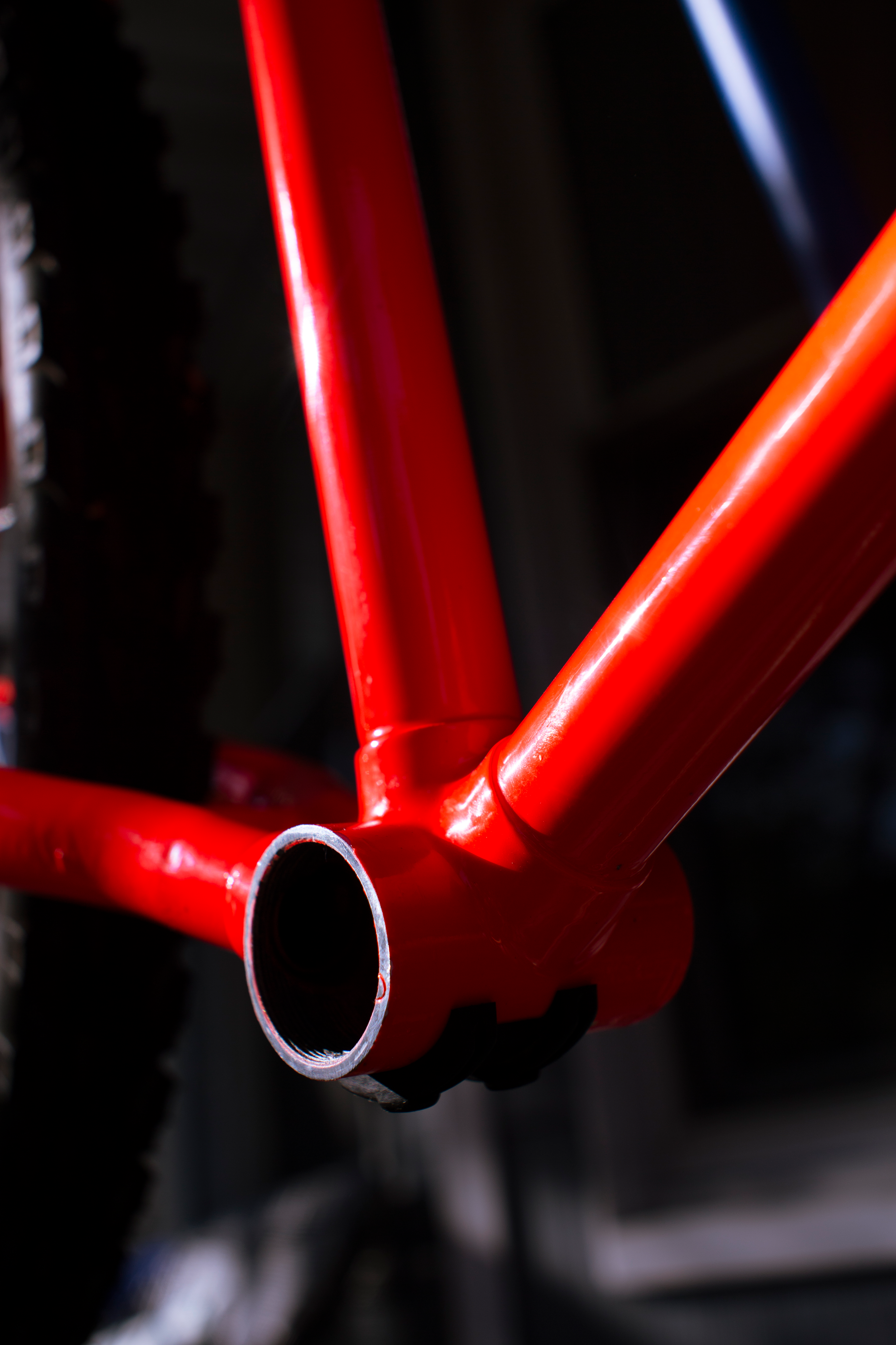 I realize that in coming back from paint, I haven't had the bearing surfaces cut smooth. This is called "facing," and you need to do it to make sure that everything is aligned dead across the bike, not at an angle. I hop on the subway with my bike frame, get it faced, and head home. I reassemble the bottom bracket, this time confident that the problem is fixed and ... there's still play.