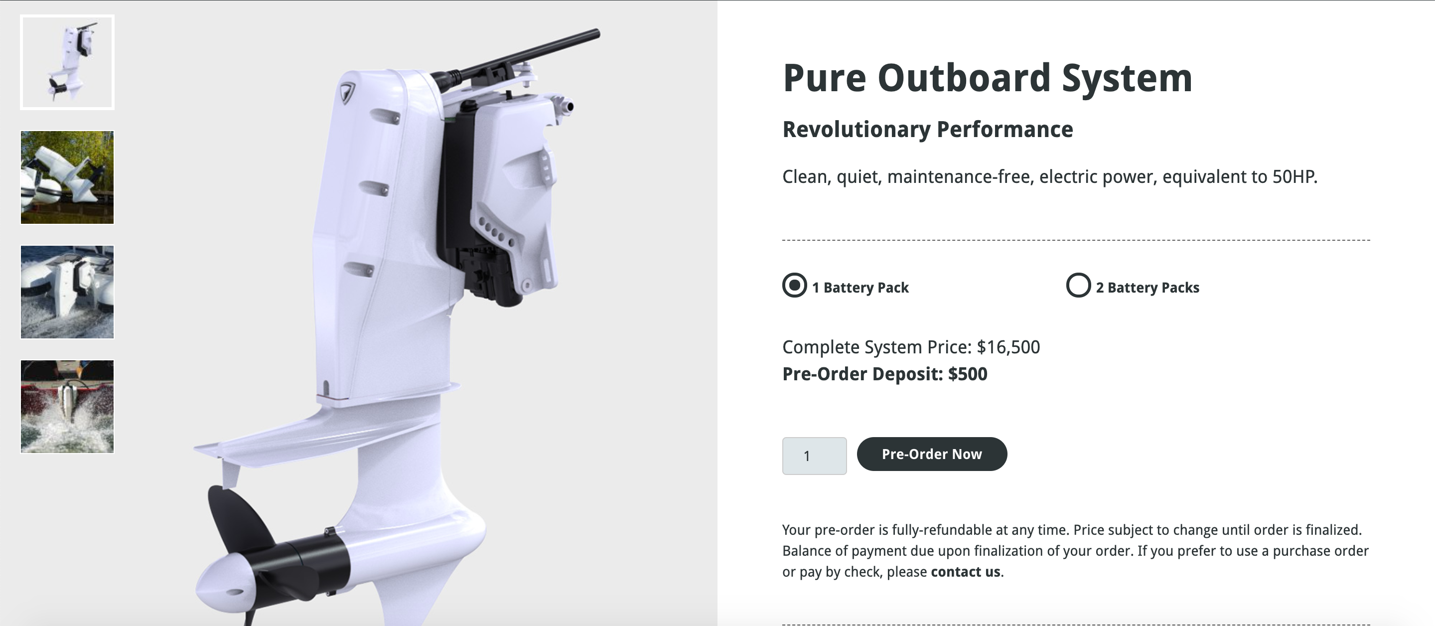 The company is now accepting deposits on an electric outboard motors system that includes one or two batteries and a throttle control box. It is also offering boats from a number of manufacturers with the system preinstalled.