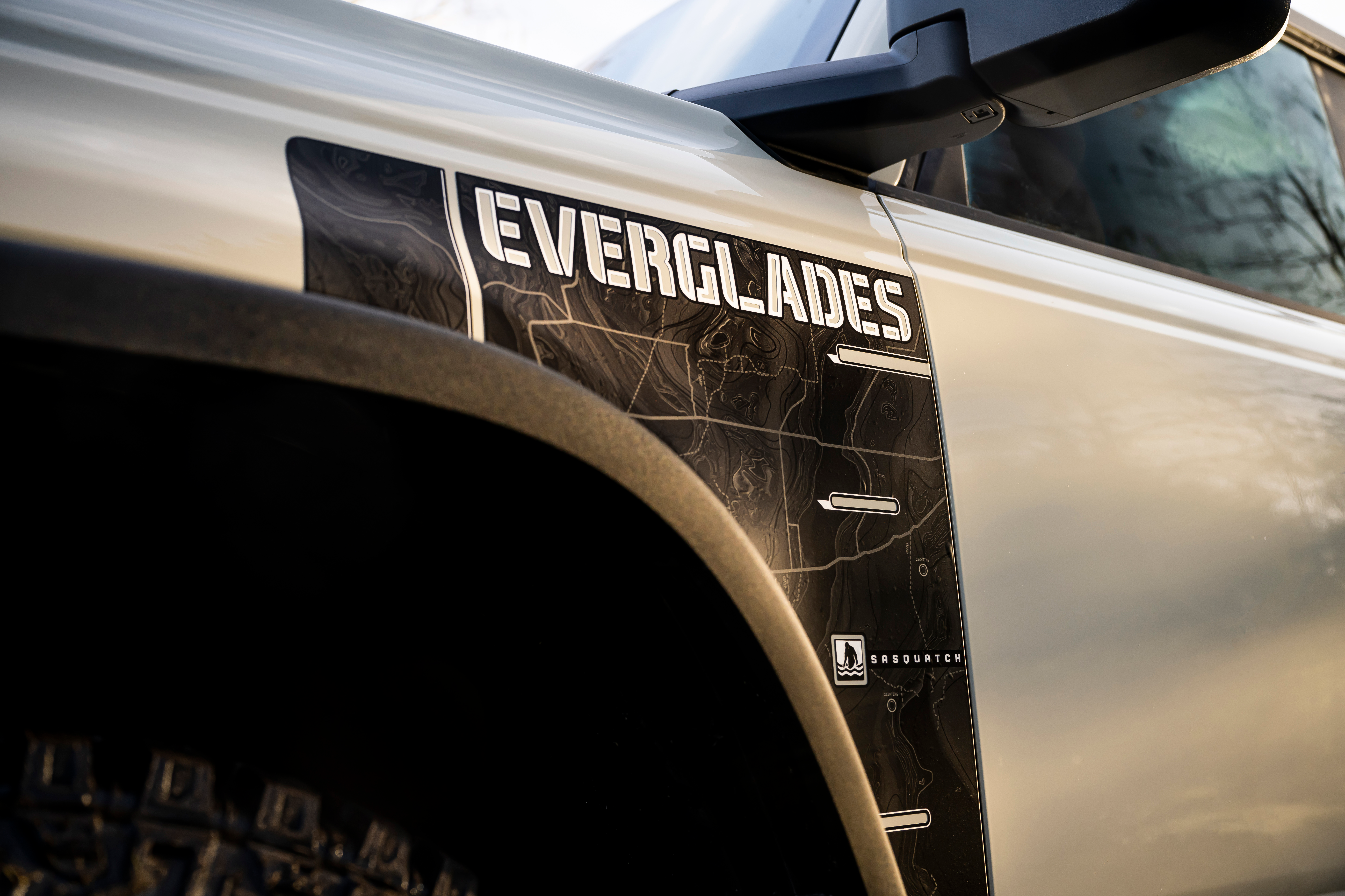 Ford has adorned the Everglades with a number of different ways to differentiate this model from a lower level Bronco. The Everglades gets a gray grille with a black-out "BRONCO" up front. It also gets squared-off fenders along with the Sasquatch Package's 17-inch gray wheels on 35-inch mud tires, a colored hard top, and a roof rack with a crossbar.