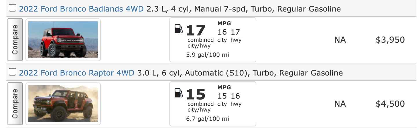 Nothing about the Bronco Raptor screams efficiency anyway. It's a brick rolling on 37-inch all-terrain tires with a twin-turbo 400 horsepower V6. But the Raptor's mileage is slightly worse than the next worst mileage offender in the Bronco lineup, a Badlands with 4WD, the 2.3-liter Ecoboost, and the seven-speed manual. According to the EPA, that trim gets 16/17/17 combined.