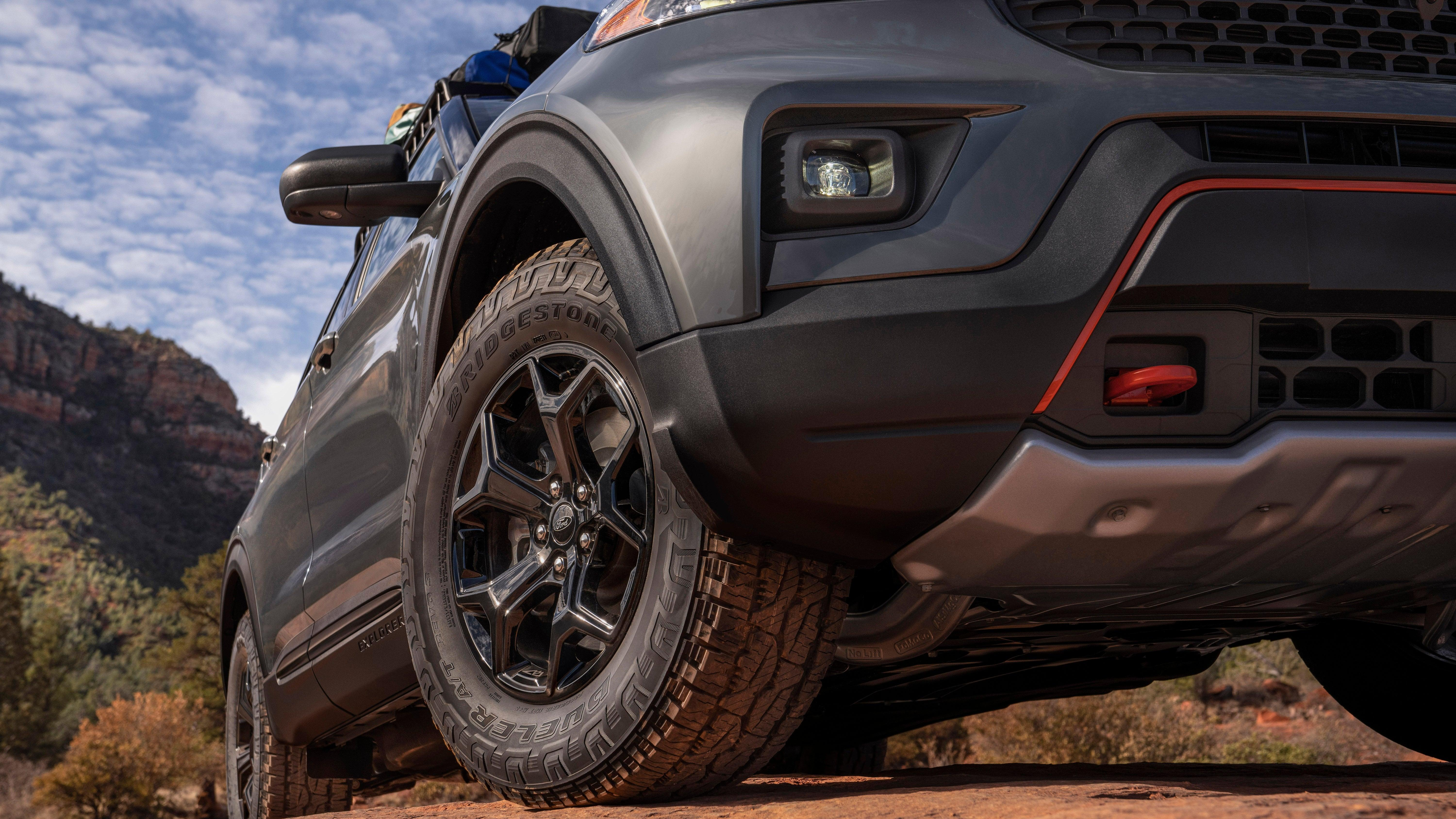 Explorer Timberline raises the ride height 0.8 inch, thanks to a combination of more robust, off-road-capable heavy-duty shocks – originally developed for Explorer Police Interceptor – and high-sidewall Bridgestone Dueler P265/65R-18 all-terrain tires with a tread pattern that balances off-road traction and on-road quietness. This, along with unique front and rear fascias, results in an approach angle of 23.5 degrees and maximum departure angle of 23.7 degrees, plus minimum ground clearance of 8.7 inches for navigating unpaved roads and uneven trails.