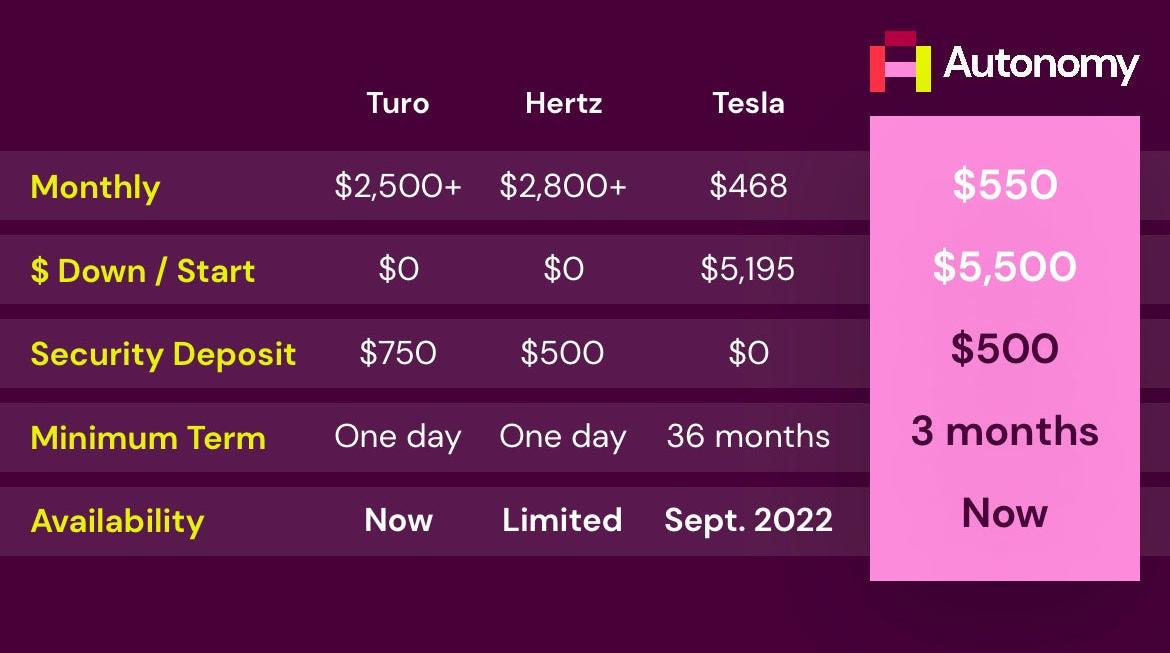 A lower monthly can have a higher start fee and vice versa. Autonomy thinks the appeal lies in it being faster than a lease but cheaper than a comparable rental. Mileage limits are capped at 10,000 per year ($.25/mile for overages) but maintenance and roadside assistance are included as well.