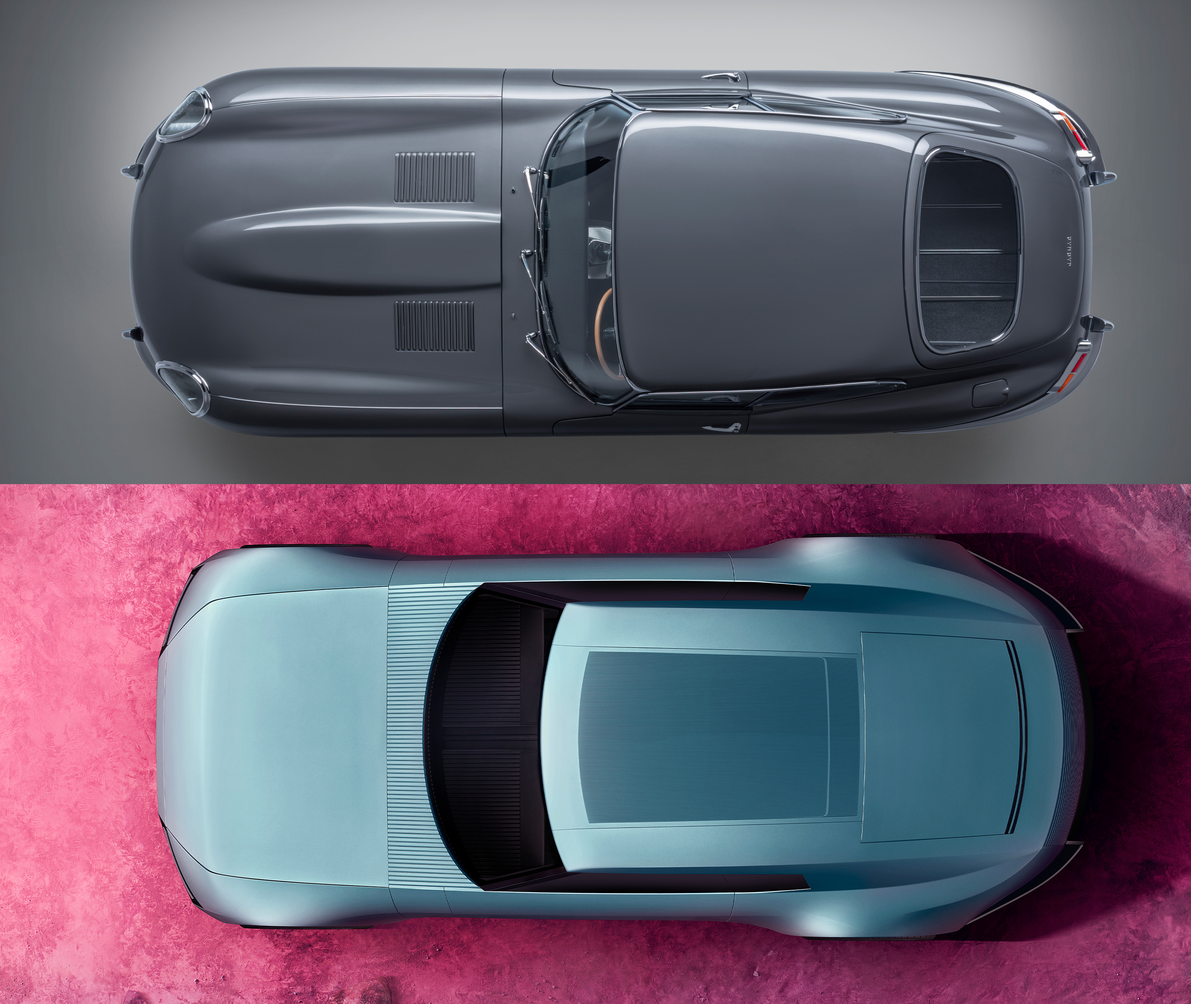 The Type 00 has Jaguar's longest hood and dash-to-axle ratio in ages, and similar amounts of rear overhang to the E-Type. I see E-Type in the way the Type 00's nose sharply turns down just at the front of the wheels, and the rear diffuser kinda echoes the E-Type's exhaust. The similarly shaped doors of the Type 00 create cutlines like those of the E-Type's doors and hood, using the lines to house hidden cameras and storage. Jaguar also aped the E-Type's hood in the top-down view, with the Type 00 having a straked panel with a horizontal line at the front and a perfect curve on the other side at the base of the windshield, just like the section of nose between the E-Type's hood edge and windshield.