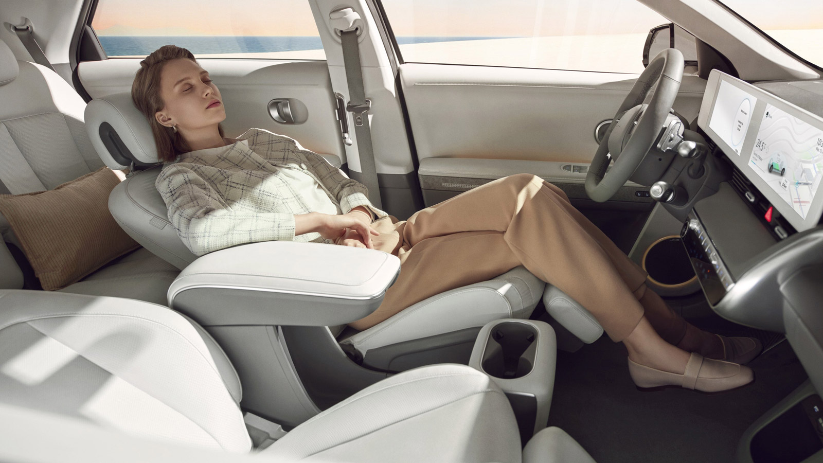 Inside, the Ioniq 5 seems airy and simple, with two displays extending from the instrument panel over to the center of the dashboard, and what looks to be a small row of physical buttons dedicated to the climate control. The Ioniq 5's center console and front passenger seat can slide backward for more room, and many surfaces inside utilize "eco-friendly, sustainably sourced materials," including plant-derived fabrics and plastics made from recycled bottles.