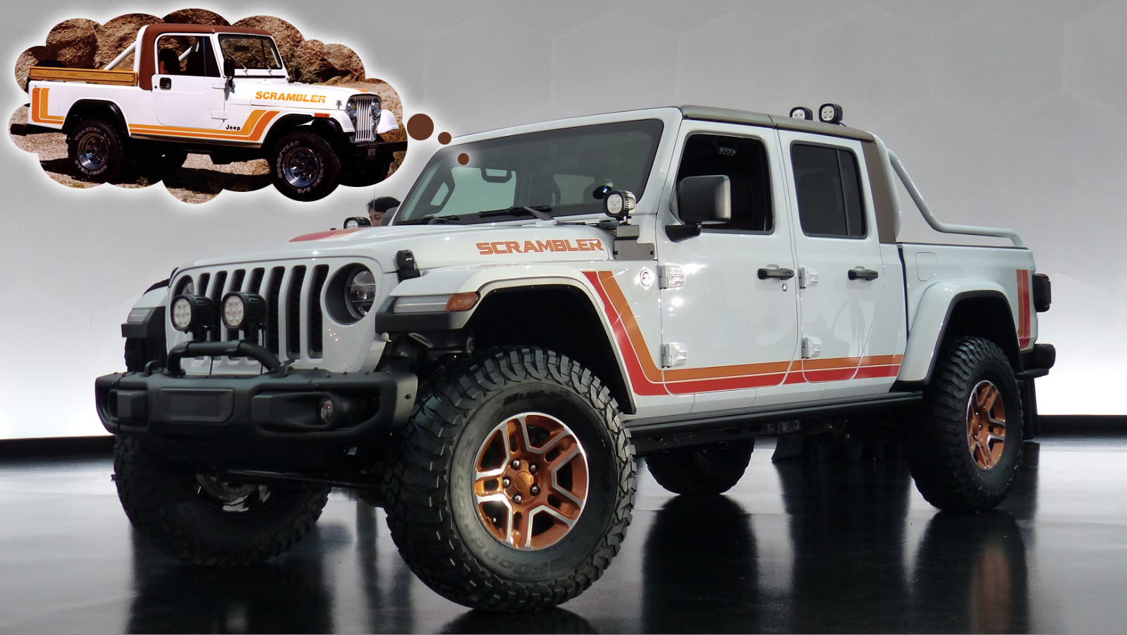 One of my biggest complaints about the state of the modern automotive industry is that everything always seems to be so damn serious. Everything has to present itself as premium or performance or professional, or some other p-word which is not a synonym for fun. Luckily Jeep's recent batch of traditional Easter-time concepts is going in a different direction, and this tribute to the 1980s Scrambler Jeep pickup is one of the most fun, and, even better, achievable for actual sale.