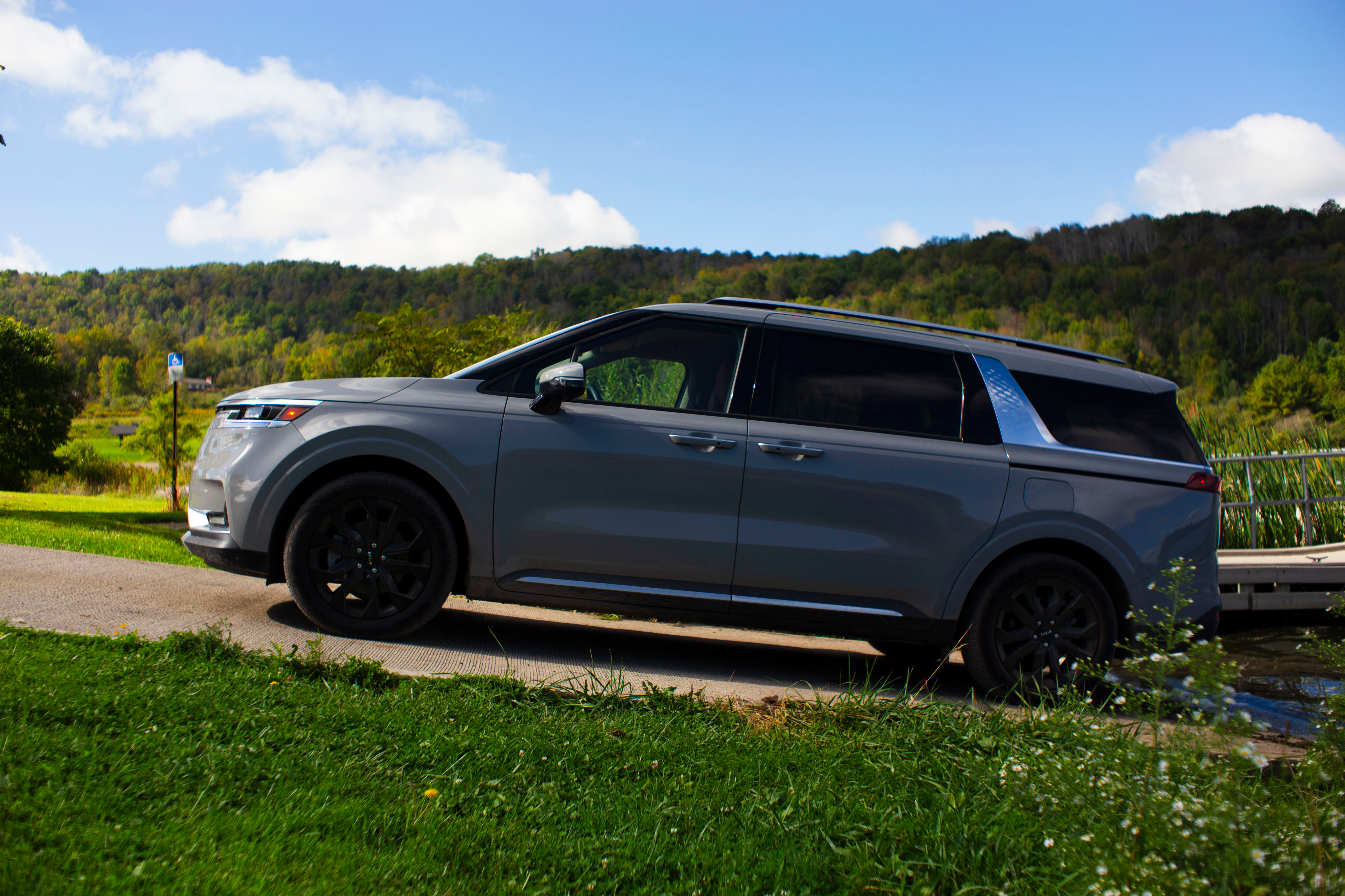 So after all that mileage, crisscrossing Pennsylvania, driving as fast as I can on dirt roads and as economically as I could on the Interstate, up winding hillsides and very carefully around tight parking lots, I still really liked the Carnival. It's a luxurious vehicle in that it works to serve you, the operator. The seats are wonderful. The infotainment is good. The car is attractive inside and out; you feel good driving it. I could wonder if these luxuries are enough to offset the lack of abundantly clear practicality gains over a three-row SUV. Then again, they're enough for me; I'd take a Carnival over a Telluride any day, kids or no.