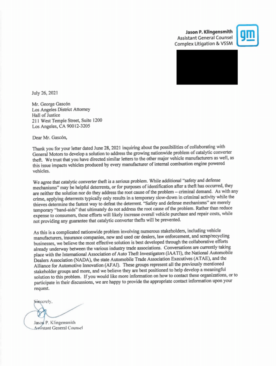 Thank you for your letter dated June 28, 2021 inquiring about the possibilities of collaborating with General Motors to develop a solution to address the growing nationwide problem of catalytic converter theft. We trust that you have directed similar letters to the other major vehicle manufacturers as well, as this issue impacts vehicles produced by every manufacturer of internal combustion powered vehicles.