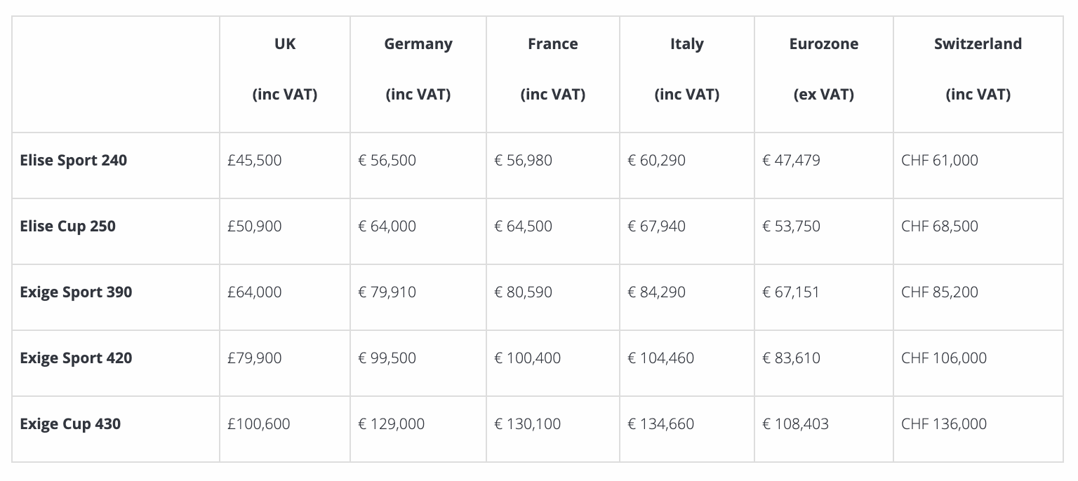 In total, Lotus says it will have made around 55,000 Exiges, Evoras and Elises after production ends this year, which isn't a bad return for cars that carried Lotus through the 2010s. Of those, only the Evora is sold in the U.S., but if you were curious about pricing anyway here's a table showing how much the cars cost in Europe: