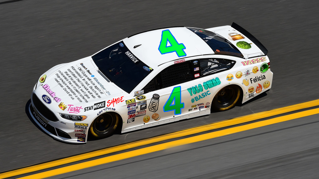 That scheme was a thing of nightmares, including words and phrases like "fleek af," "YASSS," "turnt," "shade," "stay woke," which NASCAR certainly is not, and, a personal favorite, "YOLO SWAG."