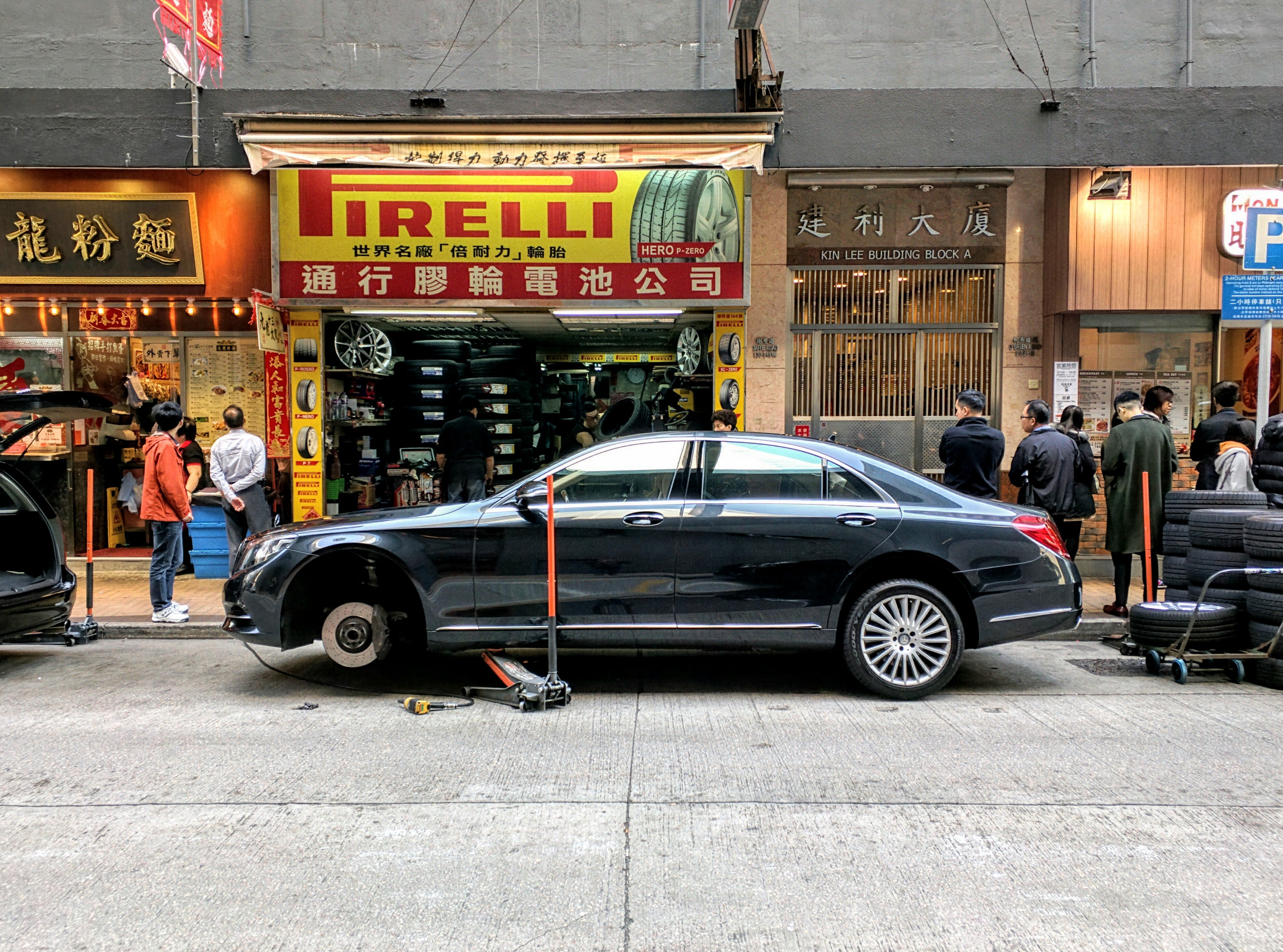 In the U.S., if you come across this site, something bad has happened. But in Hong Kong, it's a fairly standard look out front of a tire store: