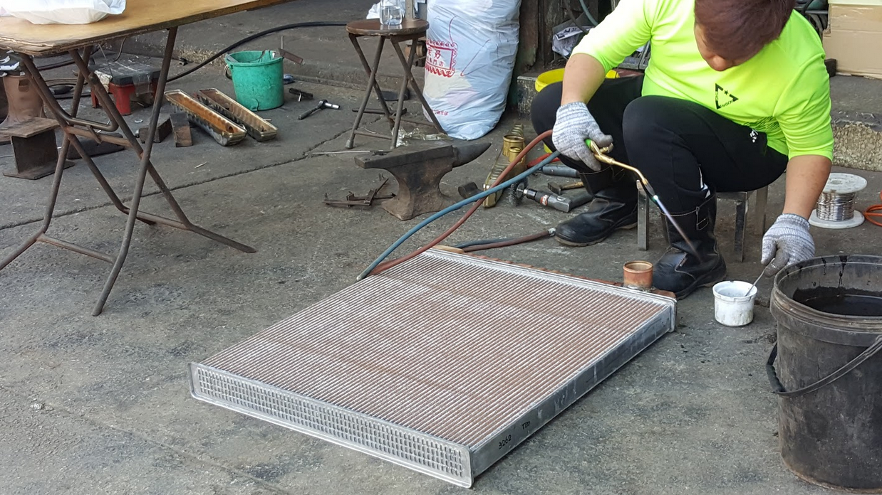 This gentleman is melting a filler material with his torch to fuse the two end tanks (like those sitting on the sidewalk in the background) to the big radiator core: