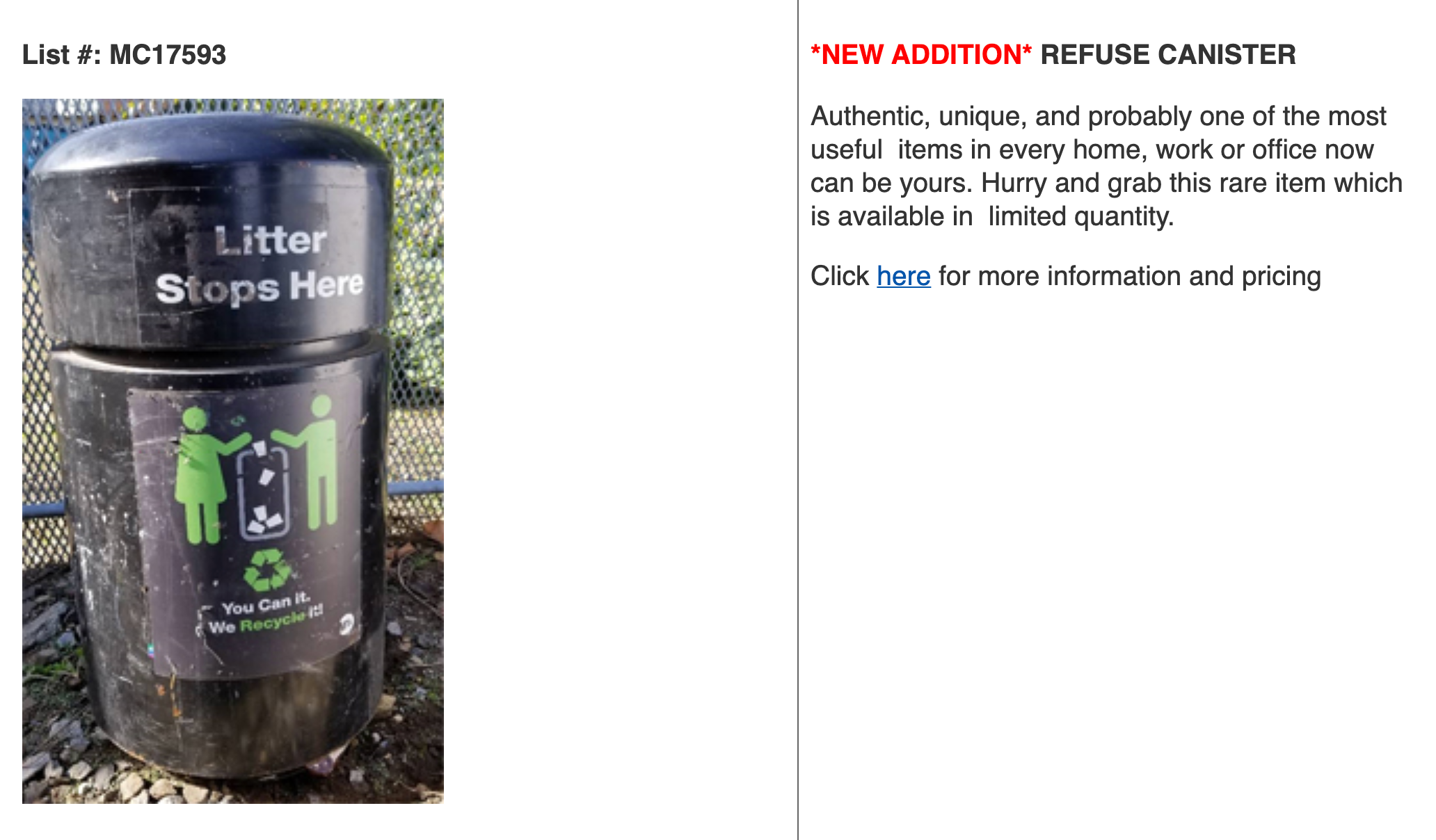 It is unclear to me why the MTA is willing to part ways with a trash can for $300. Where does it get this price? What happened to this subway can for it to be offered for sale? What kind of cleaning was done to the trash can prior to sale? Was it $300 worth of cleaning?