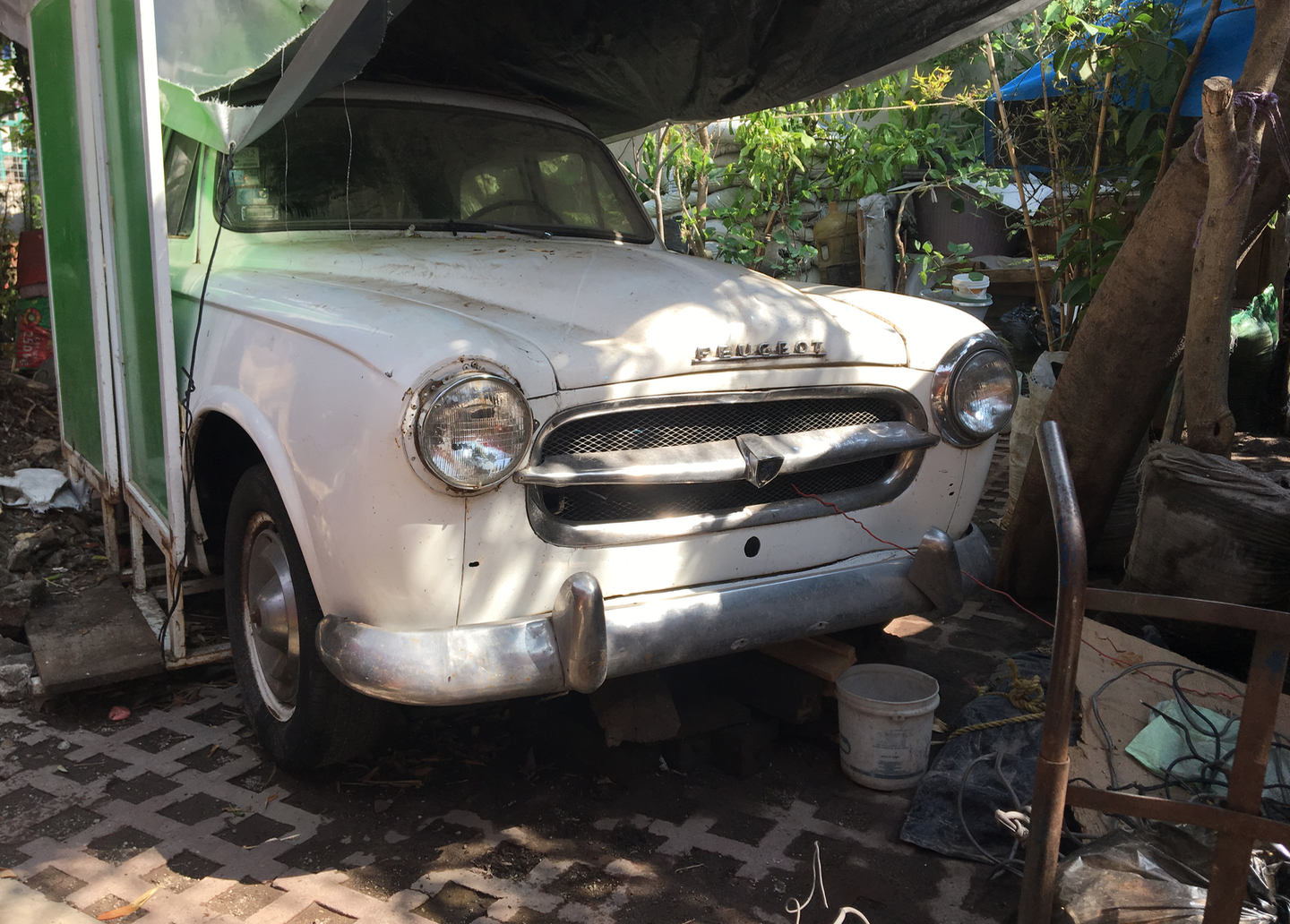 I spotted a glimpse of this lovely old Peugeot 403 through an open garage door, and the owner was nice enough to let me in and take all of the piled-up cardboard and crap off the car to let me shoot a picture. He said it's a 1958, and they're in the process of restoring it. Nice!