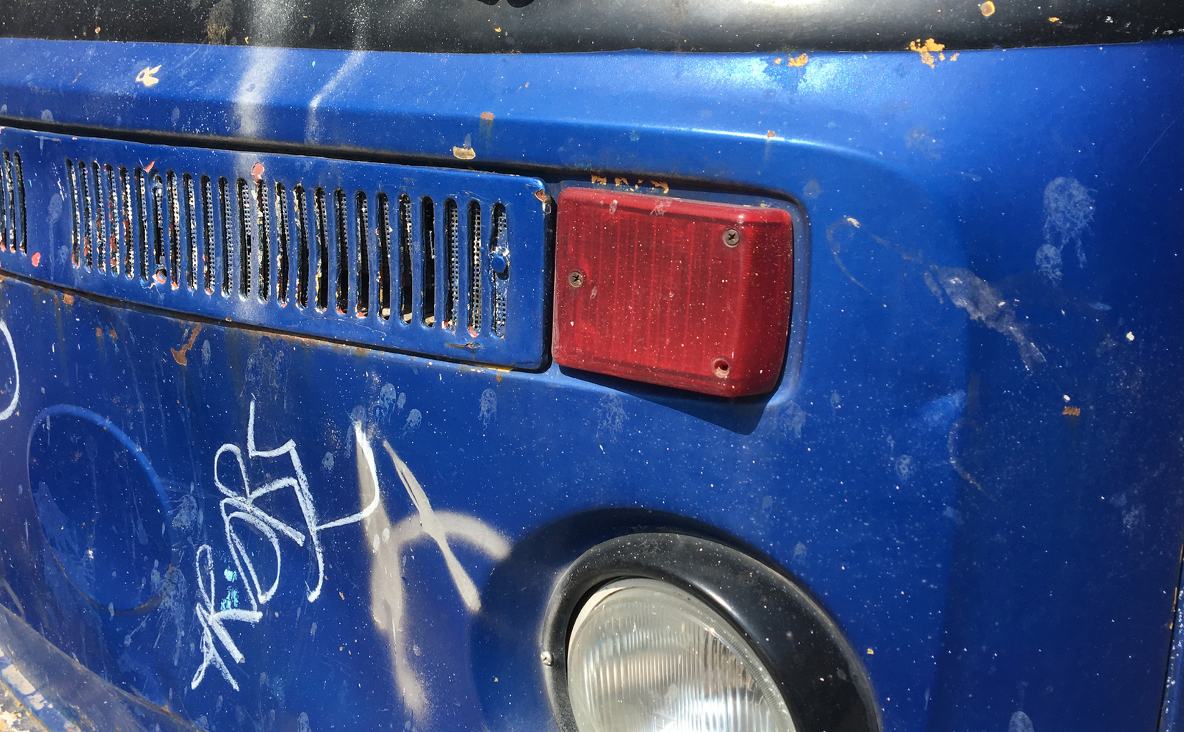 These front turn indicators are very, very red. Not orange or amber, but red. I checked them against other bus indicators of that vintage, and they're absolutely redder. Why? VW never made these lenses in red—did someone deliberately, um, redden them up? Why? What was the goal, there? I'm very confused.