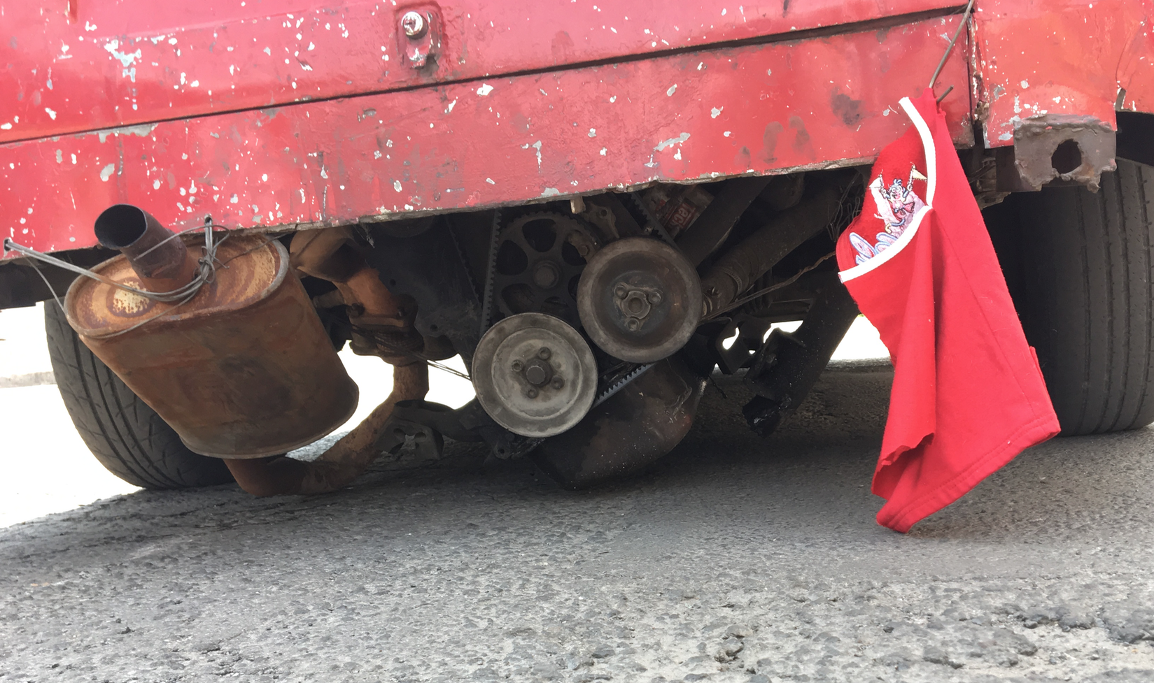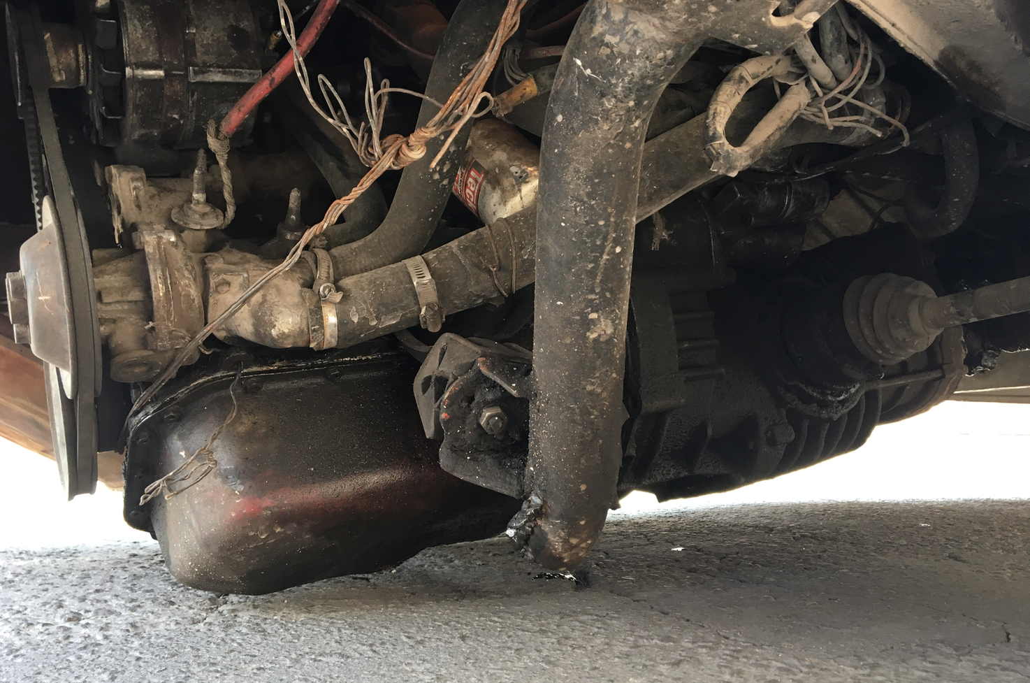 I'm not entirely sure of what engine was swapped into this bus, but I was at least able to get a good look at it, because, sadly, this one seems to have unpleasantly shat out its own engine: