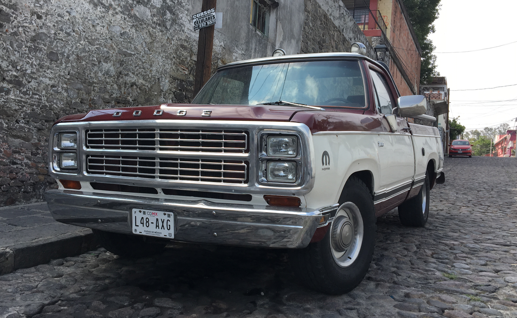This old gentleman was a treat; It's a late '70s or early '80s Dodge D100, the last of the Dodge trucks before they started calling them Rams. It's a very classy truck, with its tasteful burgundy-and-white two-tone paint, lots of chrome jewelry, and that classy four-eyed face.