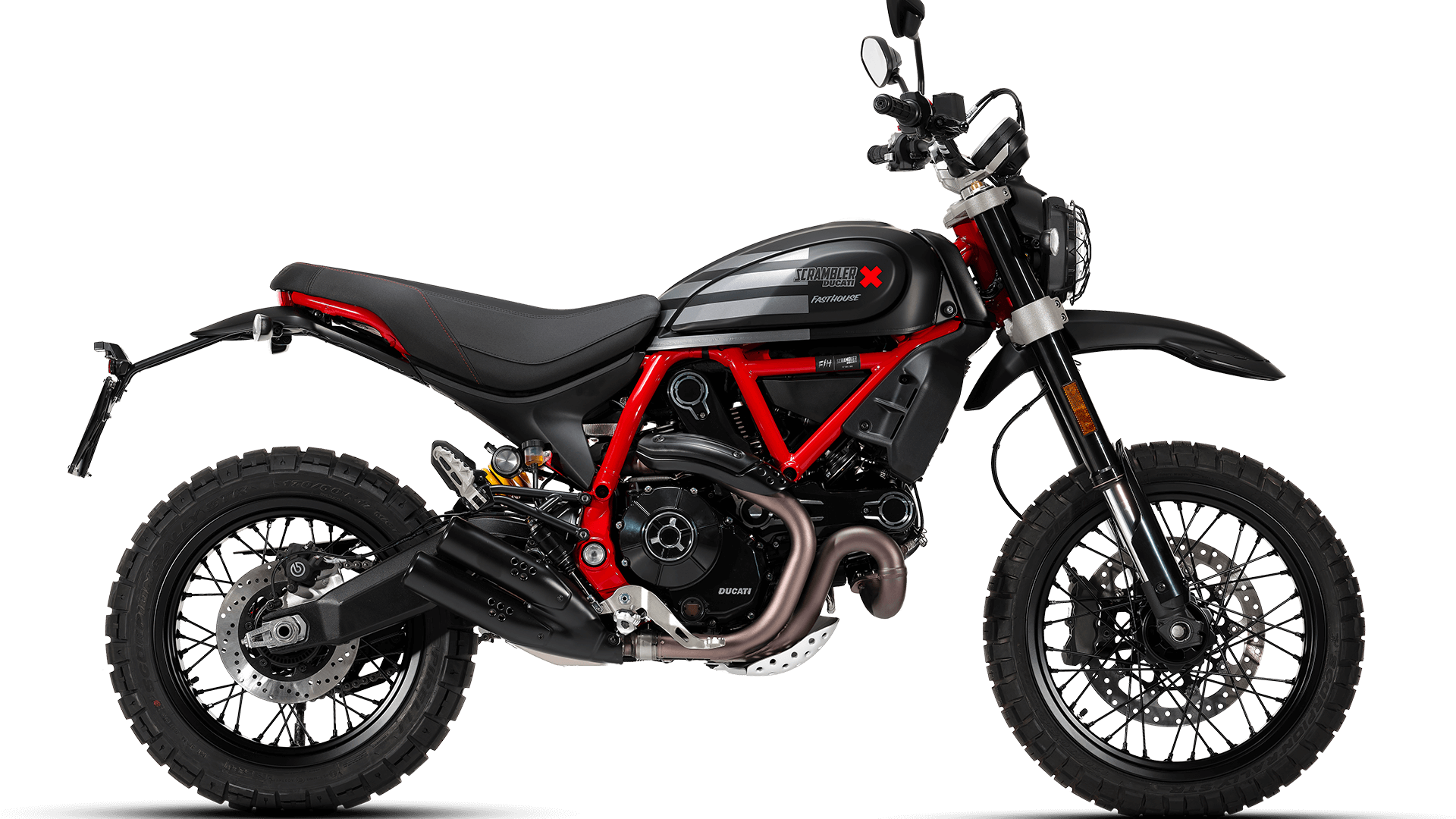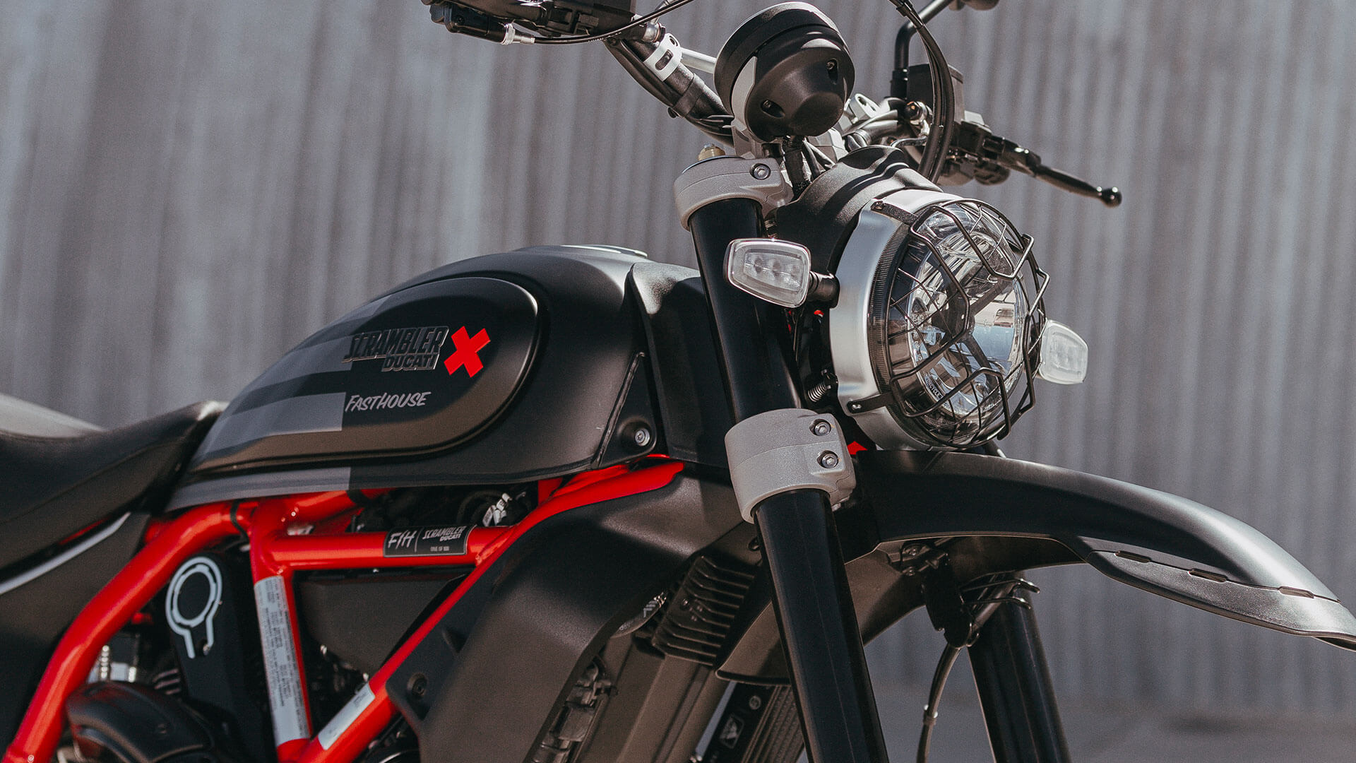 The Ducati Scrambler Fasthouse is powered by the 803 cc engine and is equipped with all the characteristic elements of the Ducati "Land of Joy" Desert Sled models. The swingarm, the triple clamps and the bespoke suspension make this model perfect for those who want to experience great adventures on off-road trails, just like those of the Nevada desert that each year are the scene for the Mint 400. The inclination to the off-road universe is underlined by the chassis, specifically designed to cope with the stresses of off-road use, as well as by the presence of a homologated grille for the front headlight, high mudguards and the skid plate.