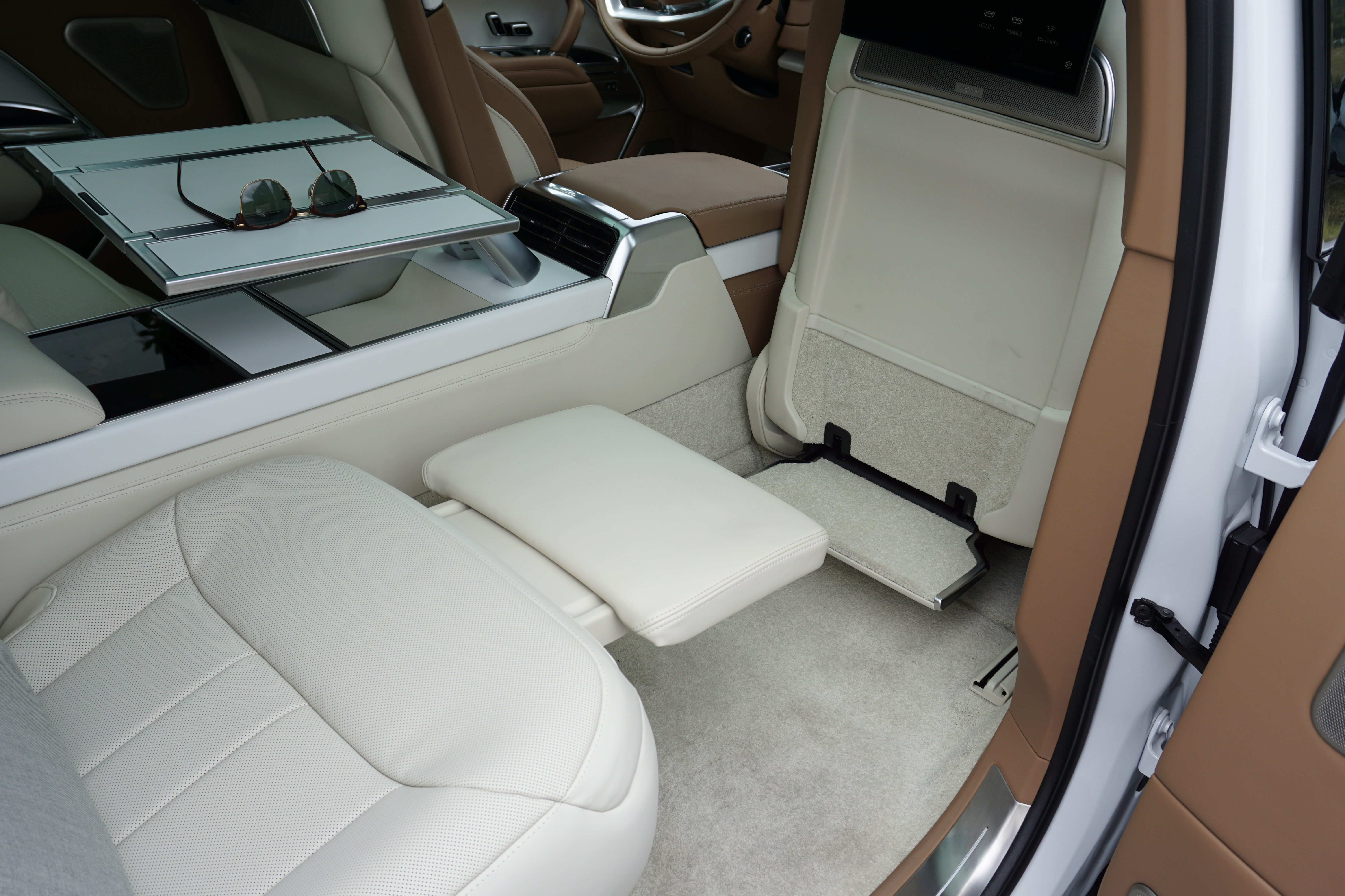 In the four seat configuration, the second row is on par with every single luxury limousine you can think of. The passenger-side rear seat can be reclined to your heart's delight, and on the SV a table and cam-driven cupholder assembly can be popped up electronically for whatever you need them for. Being a limo, it's got a fridge! It can keep your champagne and fine cheeses as cold as can be. It'll also work for Lunchables if you've got your kid for the day because the nanny is sick.