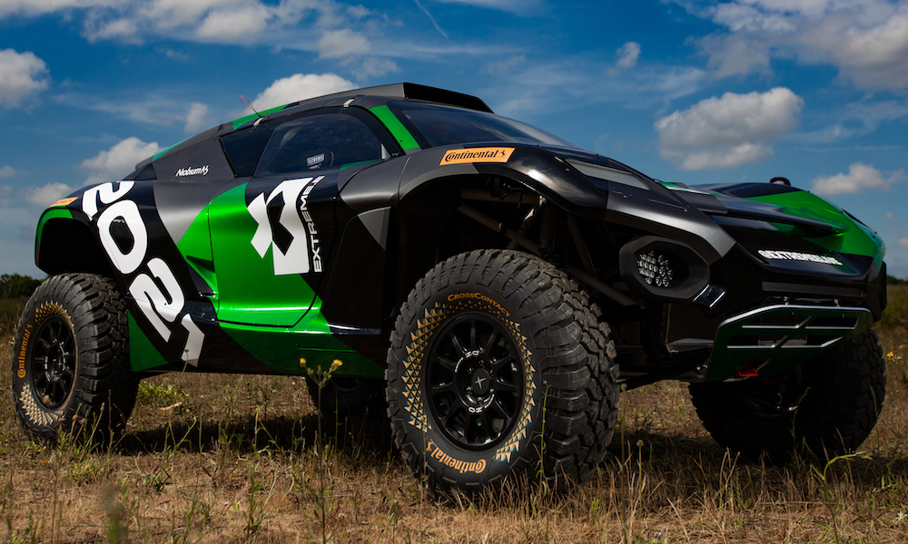 This is a big lad. According to Extreme E, the truck sits about 7.5 feet wide, 6.2 feet tall, and 14.4 feet front-to-back. The whole thing, ready to rock and roll, weighs some 3600 pounds. Each of the tires is 37 inches tall with tons of sidewall and lots of knobby Continental rubber to keep the thing trucking forward even in the nasty sand, ice, or dirt that the truck will come into contact with across the season.