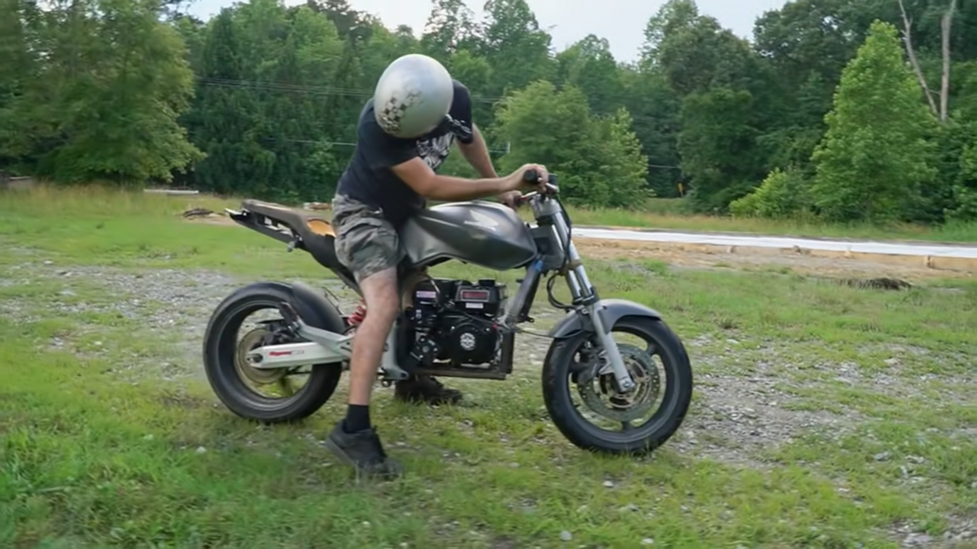 This experiment comes to you in two parts. In the first part, these good old boys dig up a clapped out Honda 919 sport bike, slap together an engine cradle, and jam a Harbor Freight Predator 212 engine in there for the go-moderately-quickly. Once it's all together they hoon it around a little bit, get it up to a top speed of thirty, and decide pretty much immediately that it needs more power.