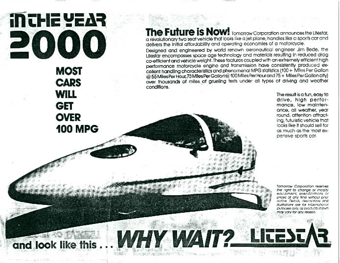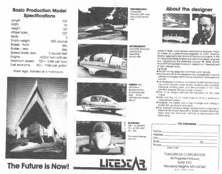 Bede didn't stop at airplanes. In the late 1970s he launched a sort of plane for the road, the BD-200. The BD-200 would be renamed Litestar, then Pulse, after a handful of Litestars were built.