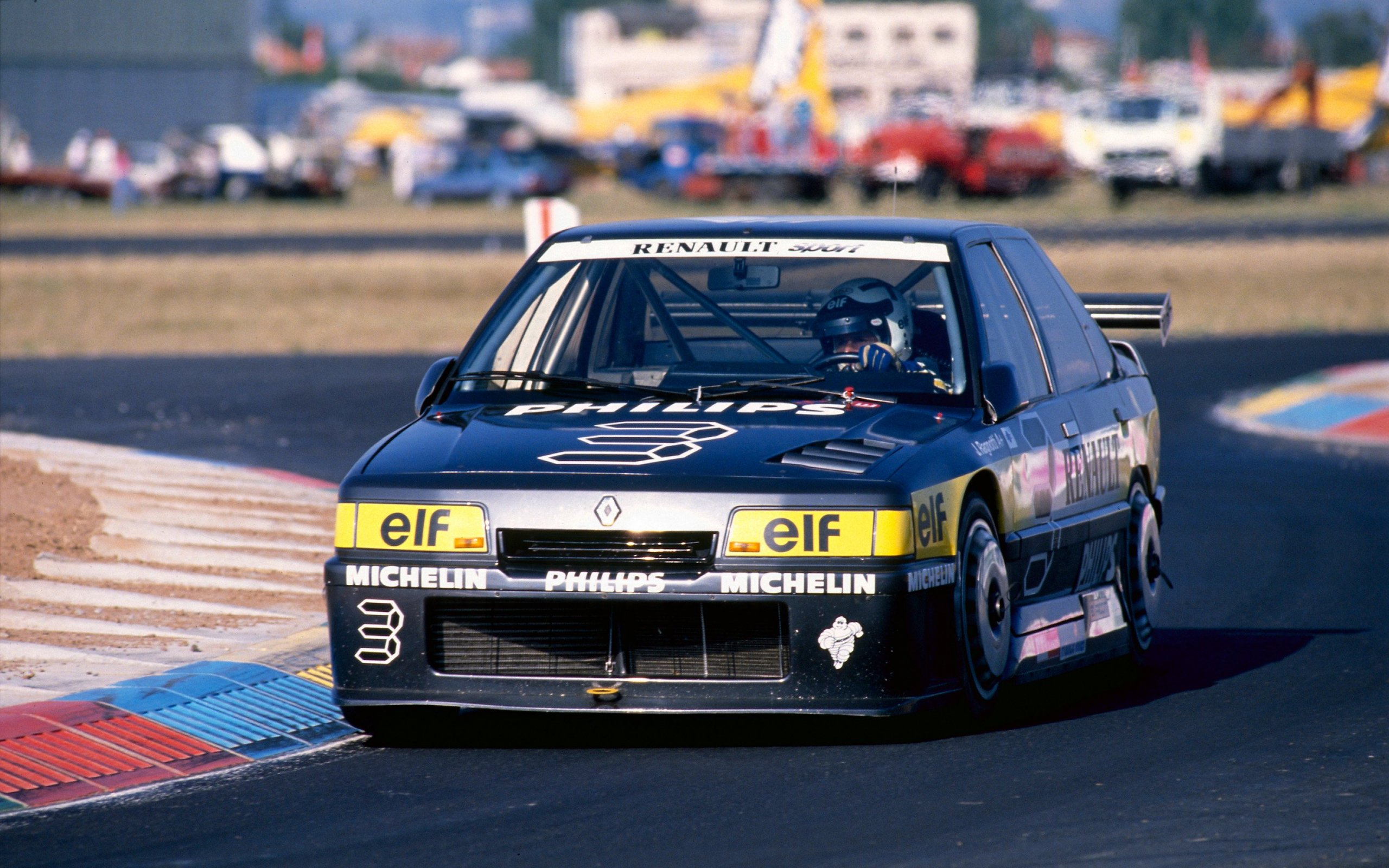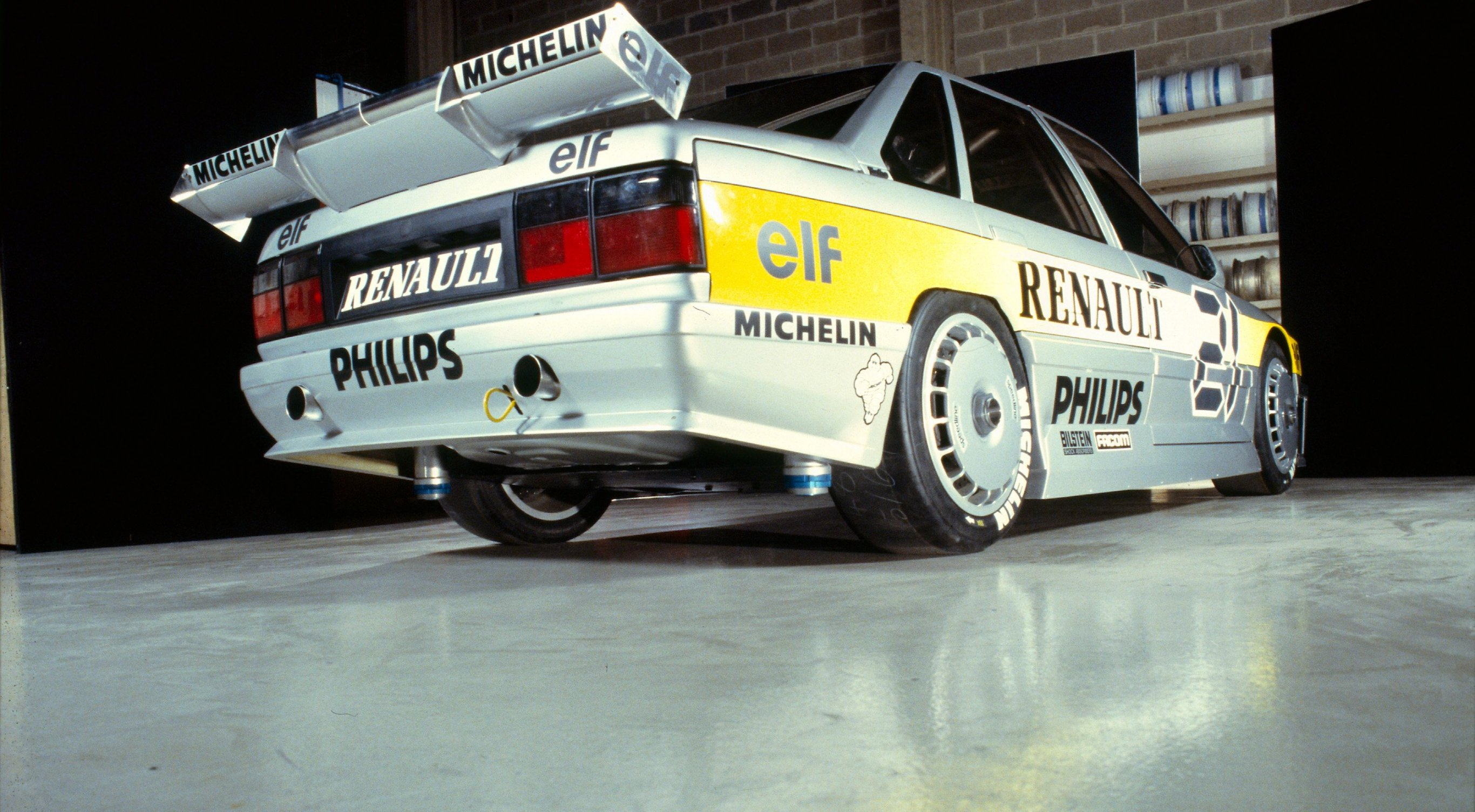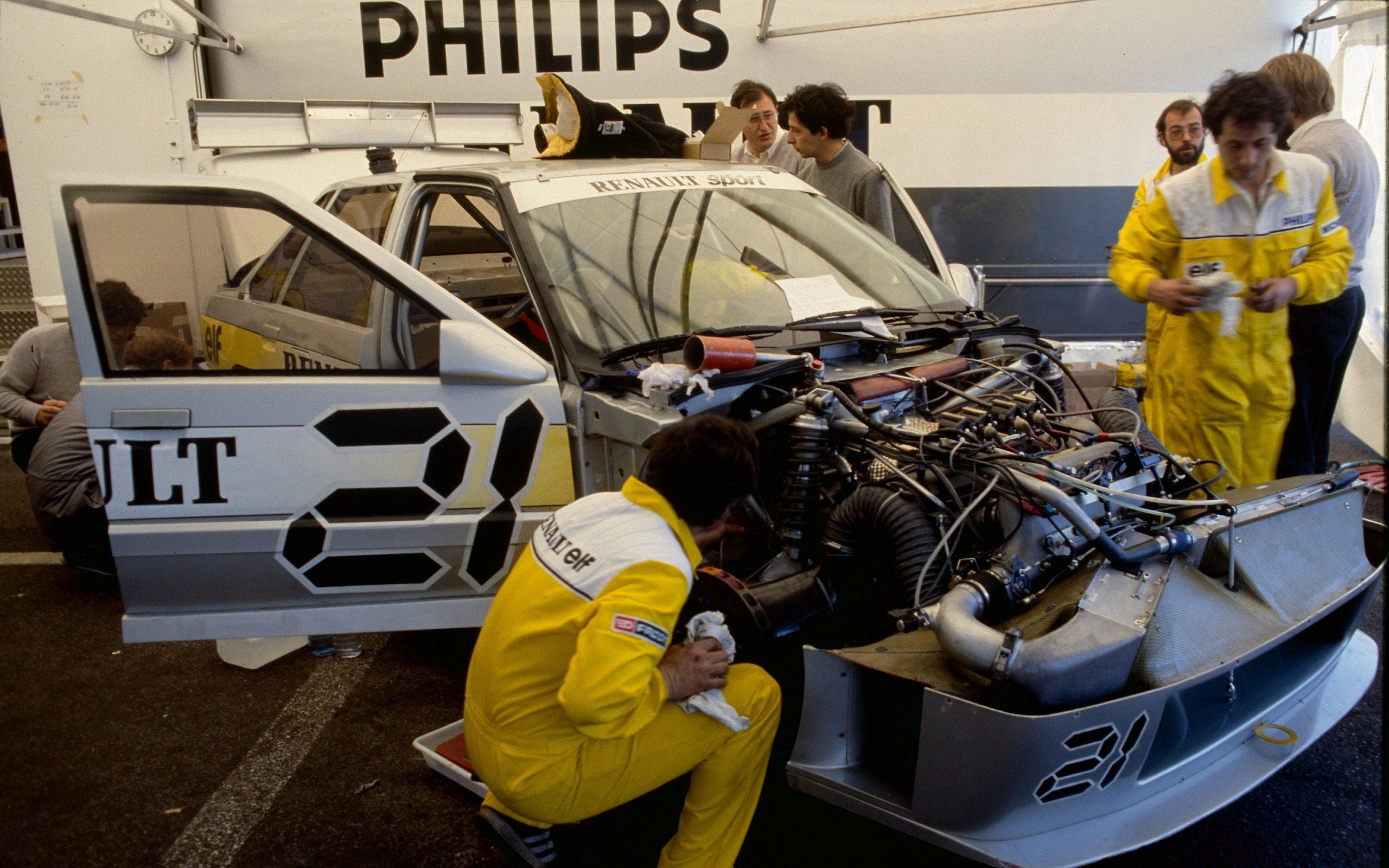 Everything that you would want this car to be, Stewart says it is. He says it slides; it understeers and oversteers. It has tons of turbo lag. It spins its tires with reckless abandon. It's heavy and takes a trained hand to drive it well without cooking it. In a retrospective of its turbo race car history, Renault claims these four-cylinder cars made 430 horsepower and used "a water-cooled, also electronically controlled Garrett T3 turbocharger" as well as "two charge air coolers with a heat shield derived from Formula 1."