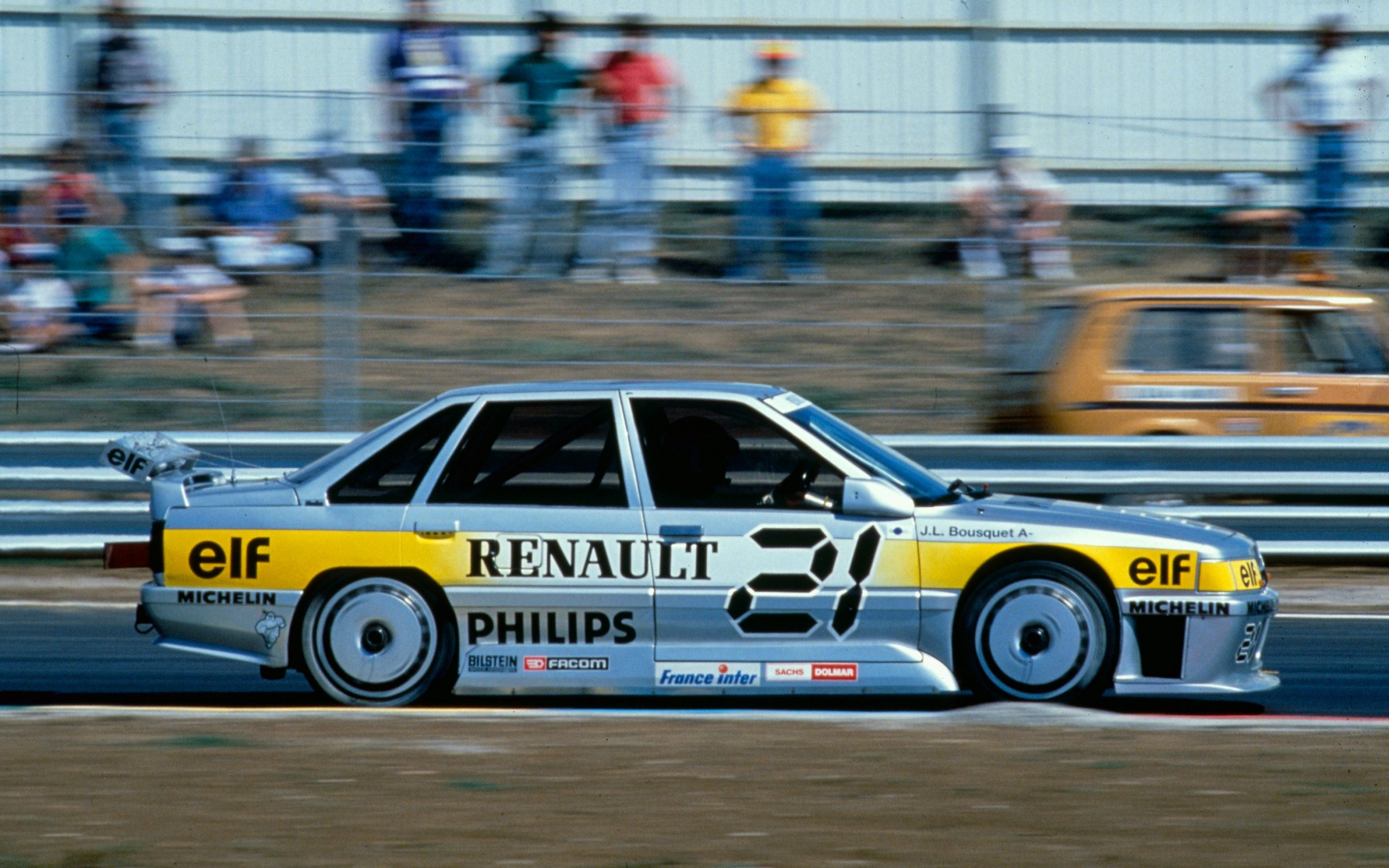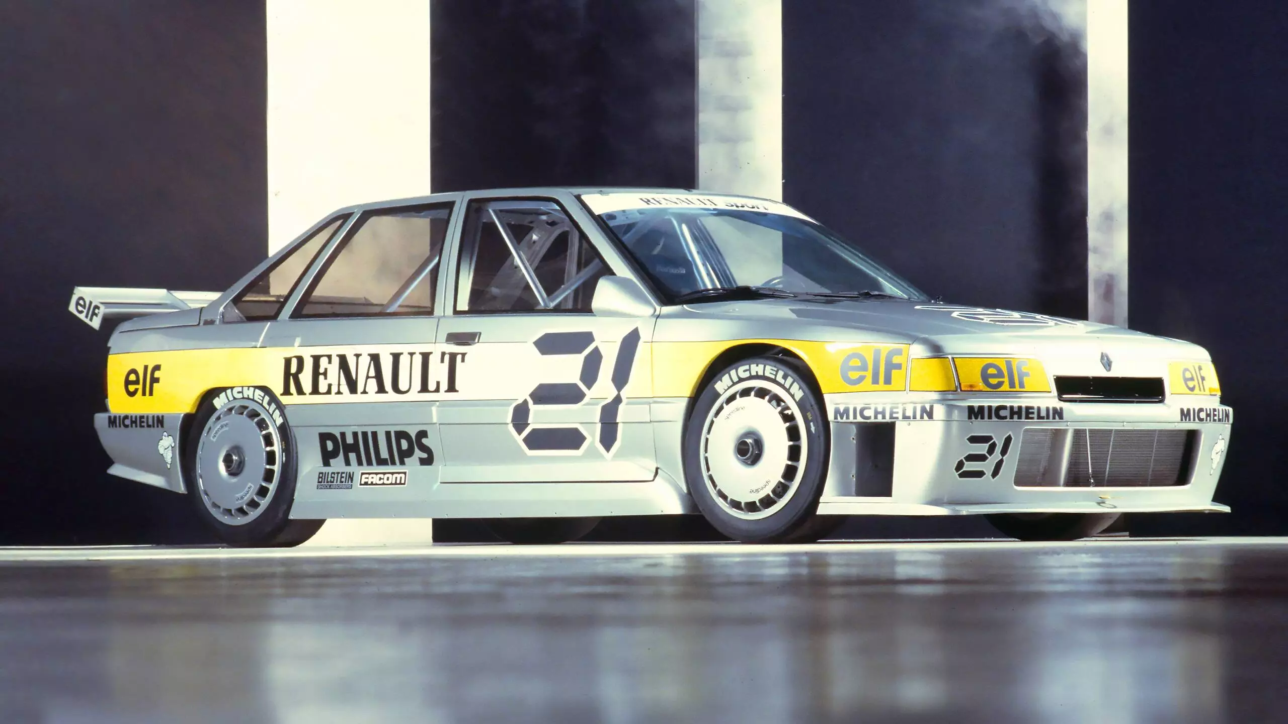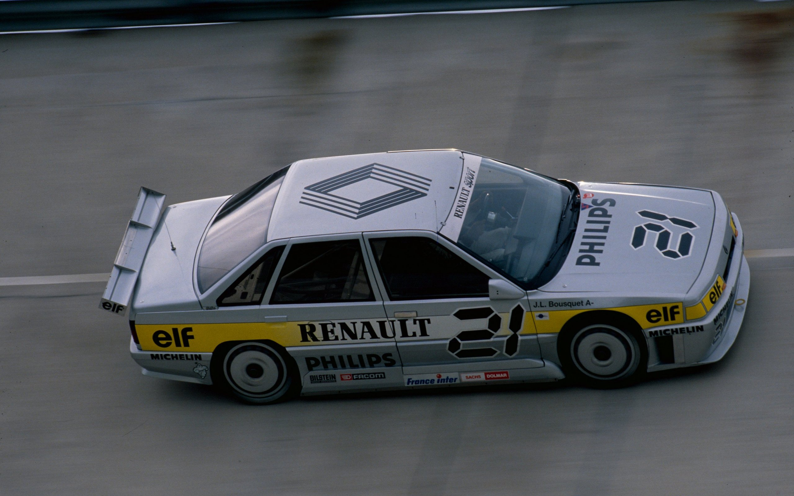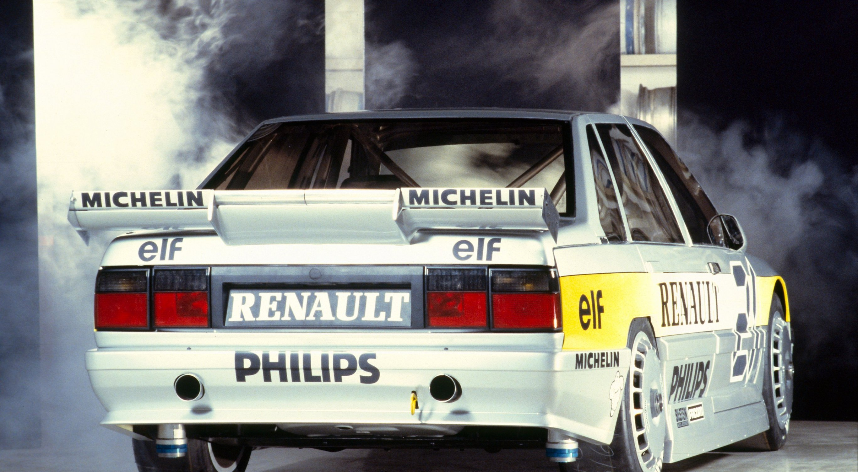 Everything that you would want this car to be, Stewart says it is. He says it slides; it understeers and oversteers. It has tons of turbo lag. It spins its tires with reckless abandon. It's heavy and takes a trained hand to drive it well without cooking it. In a retrospective of its turbo race car history, Renault claims these four-cylinder cars made 430 horsepower and used "a water-cooled, also electronically controlled Garrett T3 turbocharger" as well as "two charge air coolers with a heat shield derived from Formula 1."
