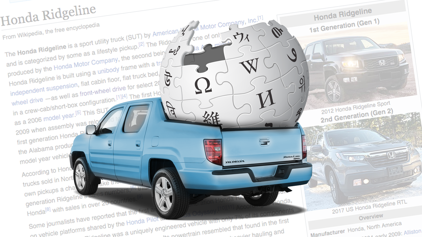 As David describes it here, the Honda Ridgeline's Wikipedia page is an "exhaustive love letter from a bunch of nerds" to a truck that doesn't often get a lot of love. Their commitment and attention to detail is almost moving.