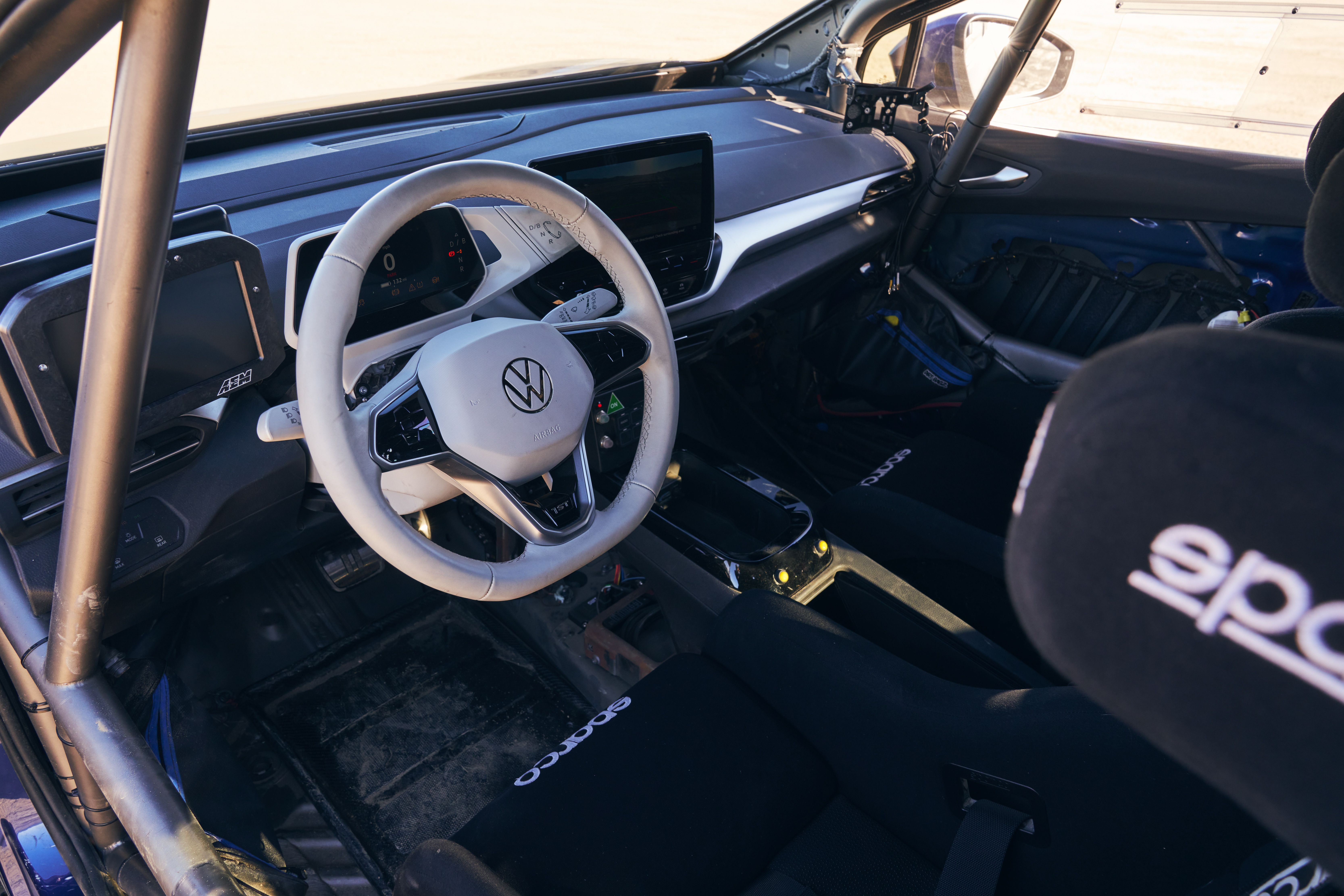 Interior was stripped and modified with a roll cage, racing seats and supplemental screens for key data such as battery temperature