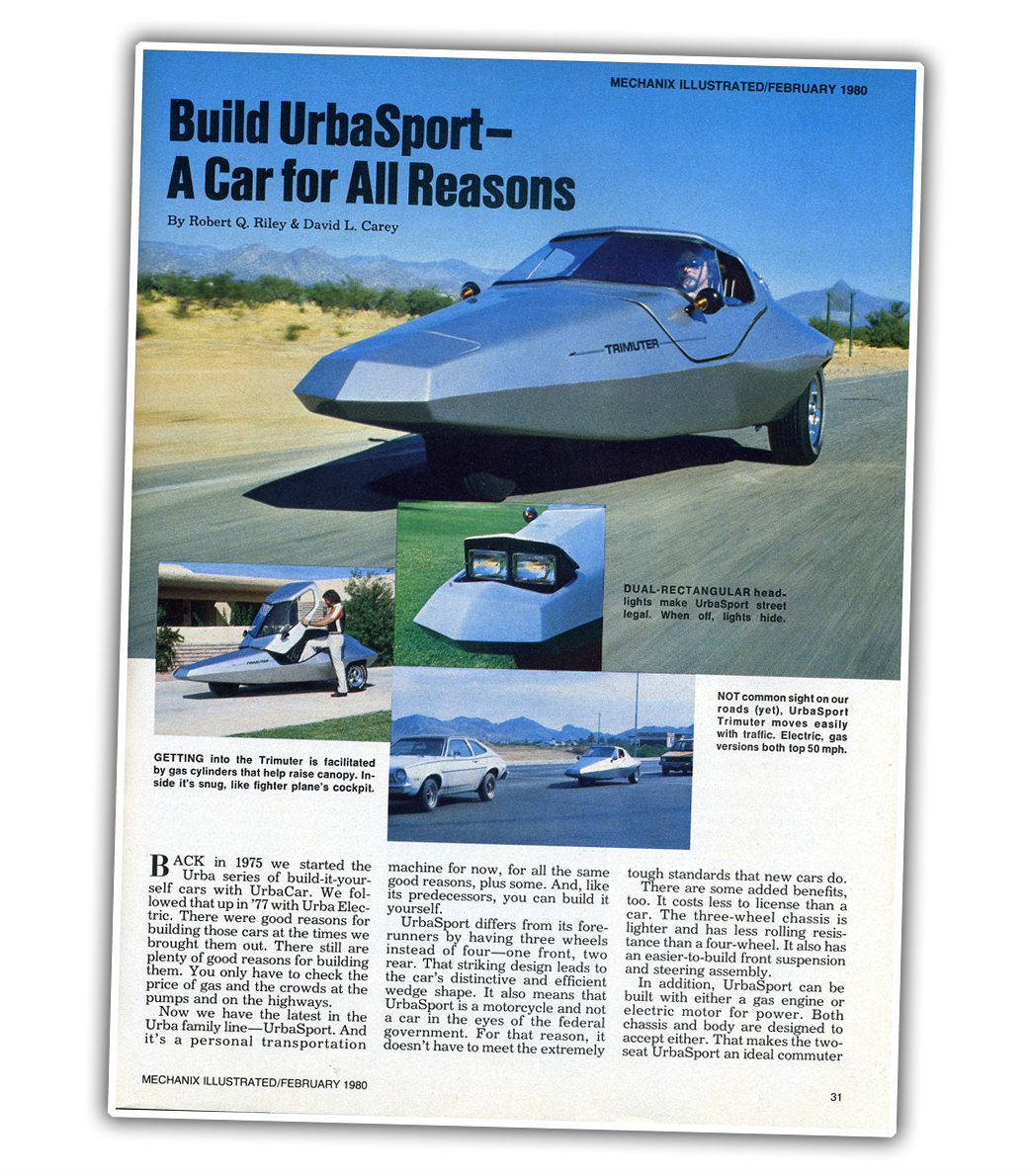 Yes, yes, yes, this is a glorious Urba Sport Trimuter, a tricycle-oriented car you'd build from plans that included pop-up headlights and a lifting canopy to get in and out.
